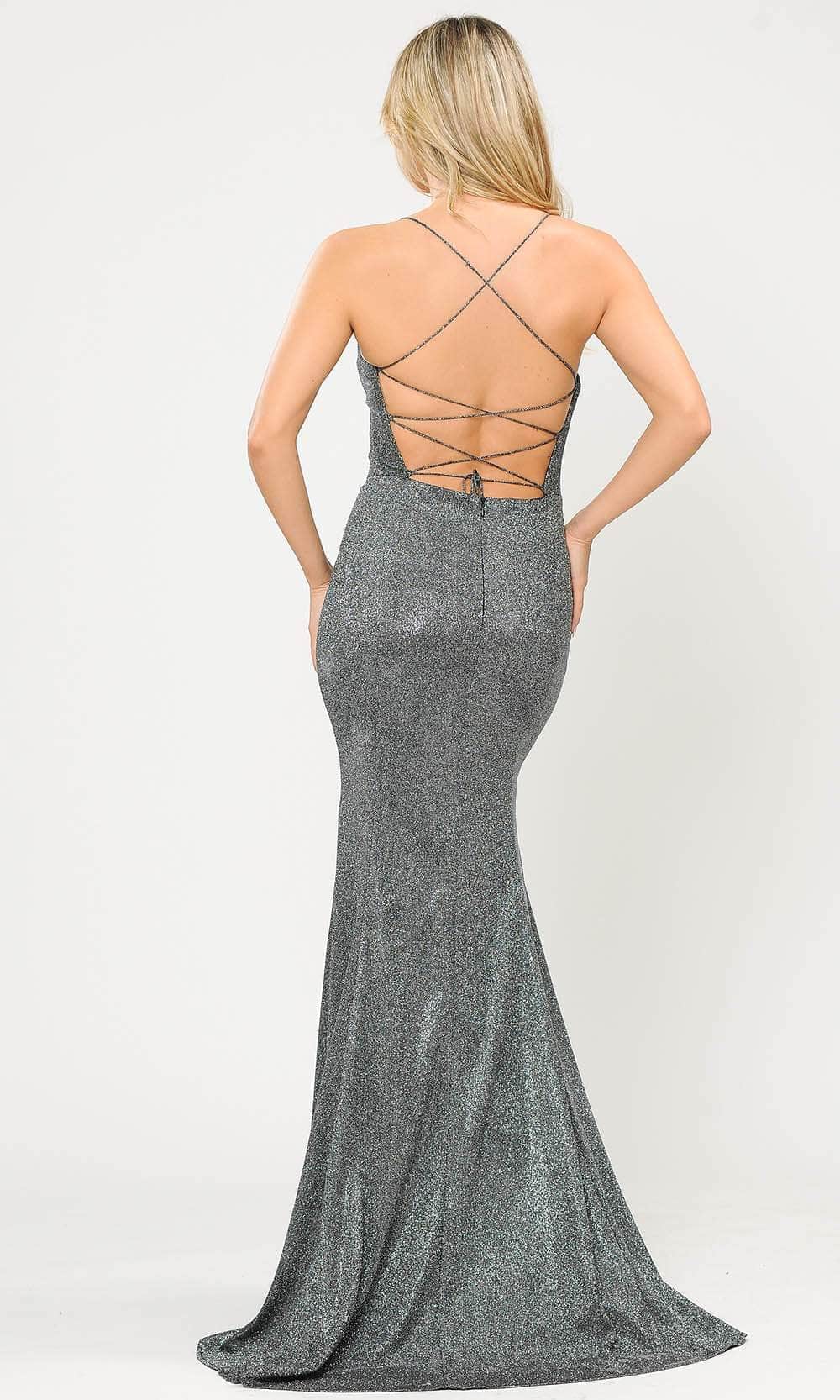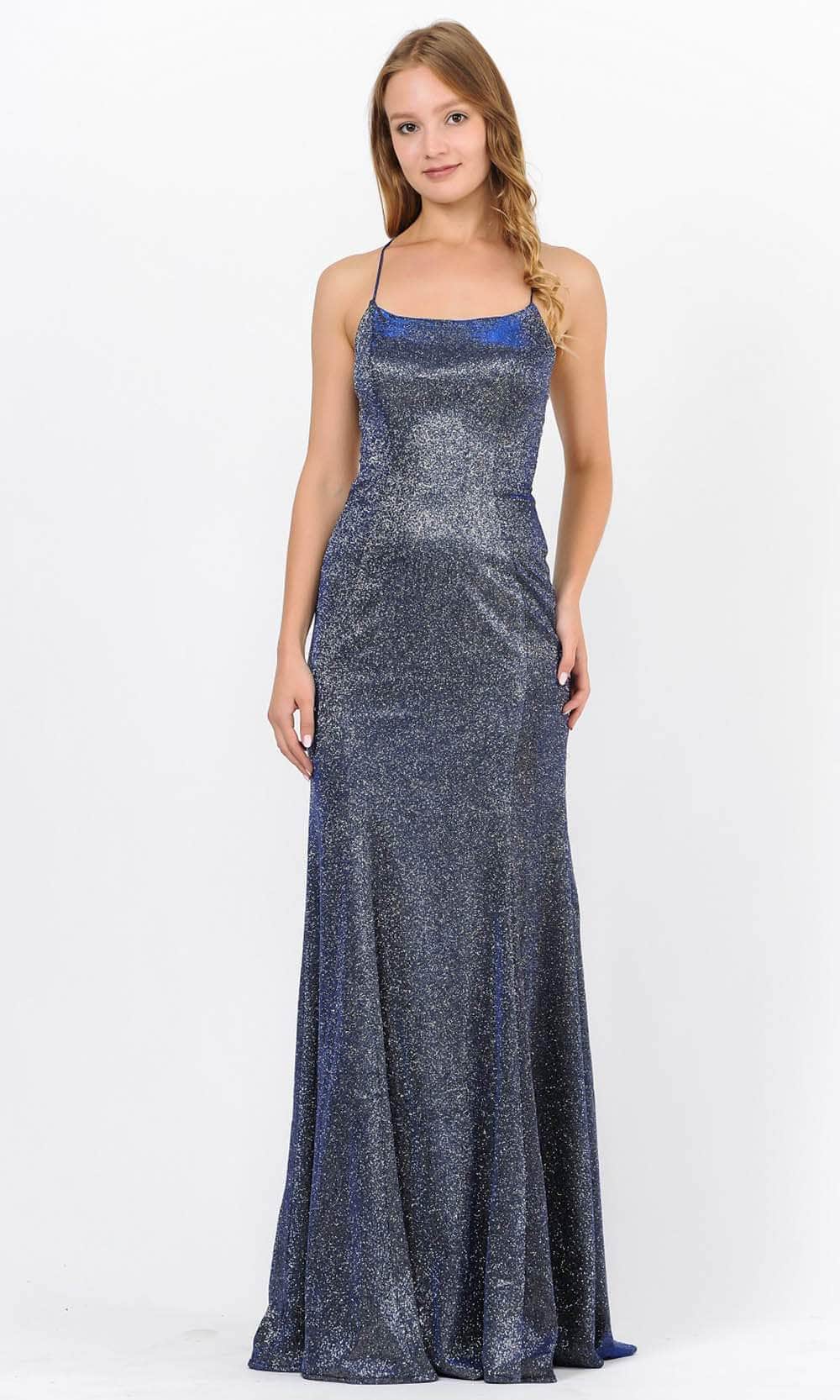 Get noticed in any crowd wearing this dress from Poly USA 8666. The glittered fabric creates a truly magical effect, while the corset bodice features a scoop neckline that is delicately fastened with spaghetti straps. The back of the dress showcases a chic criss-cross lace-up design that extends into a sleek sheath silhouette skirt. The skirt elegantly finishes off with a smooth sweep train that creates a truly glamorous look. This Poly USA 8666 creation is simply captivating! Models are wearing Magenta, Rose Gold, Royal, and Silver/Blk colors.