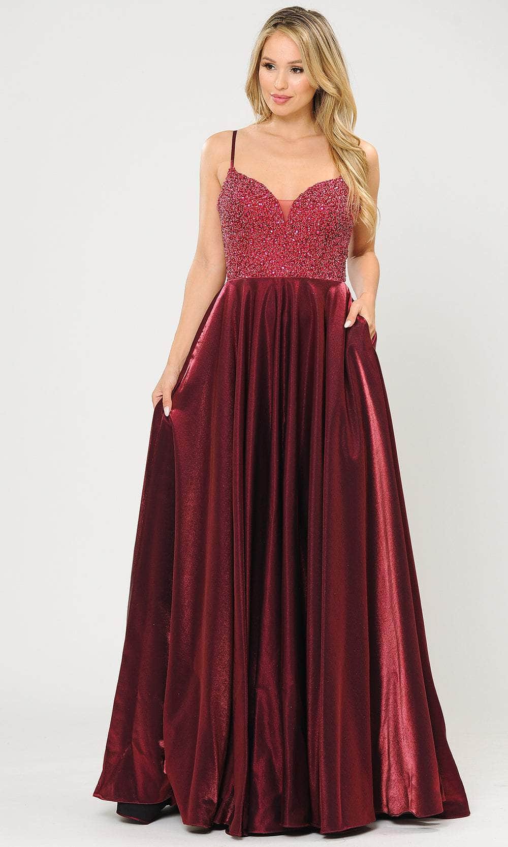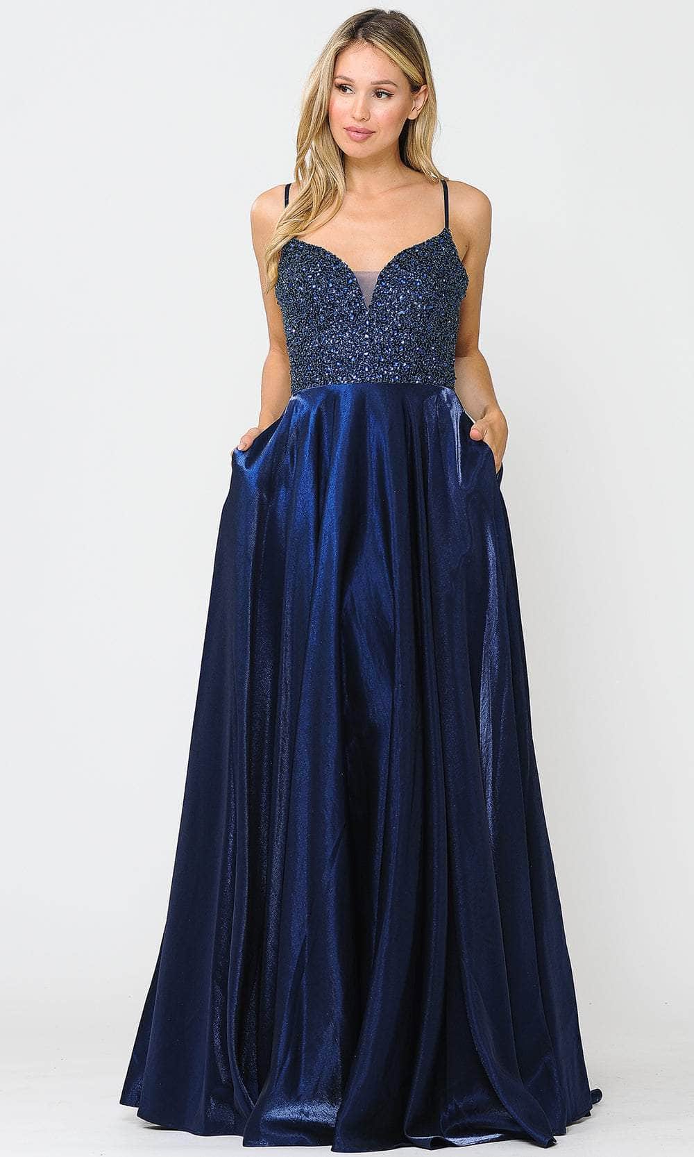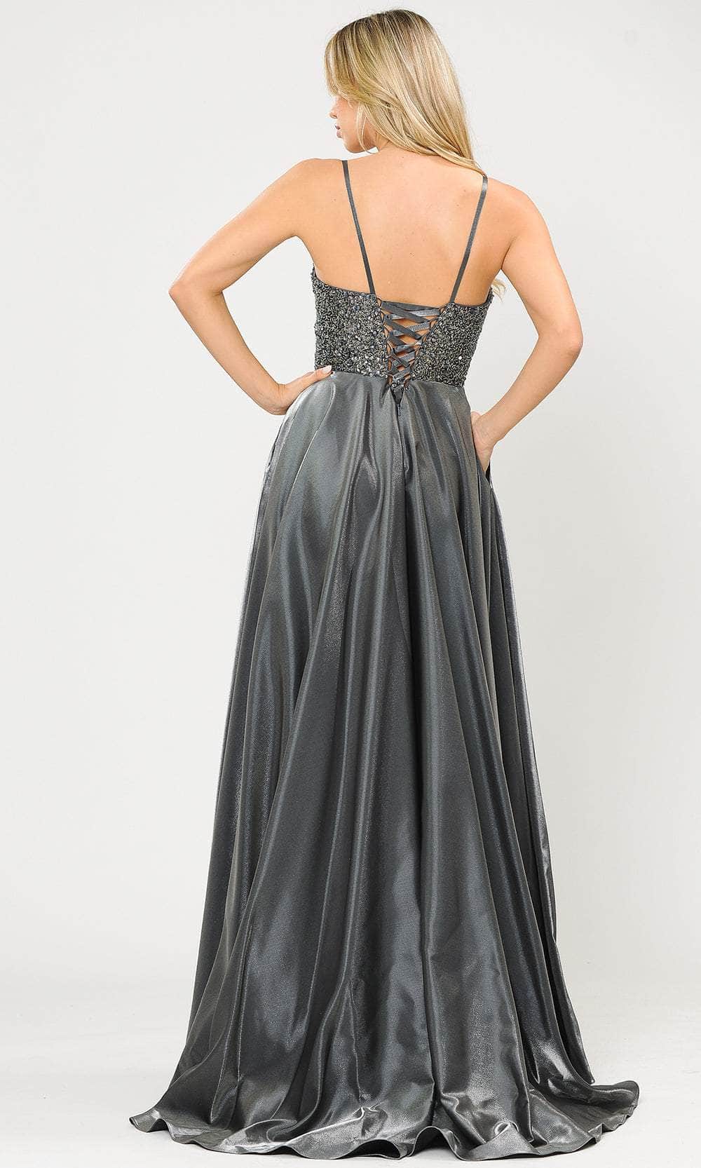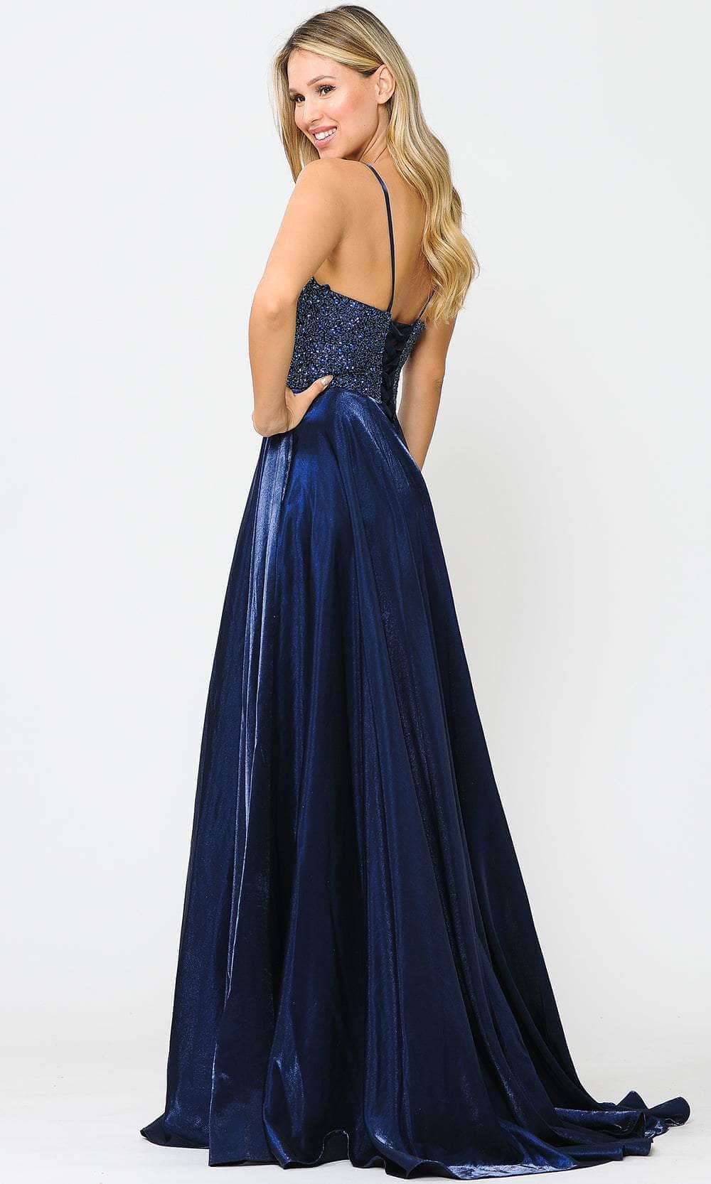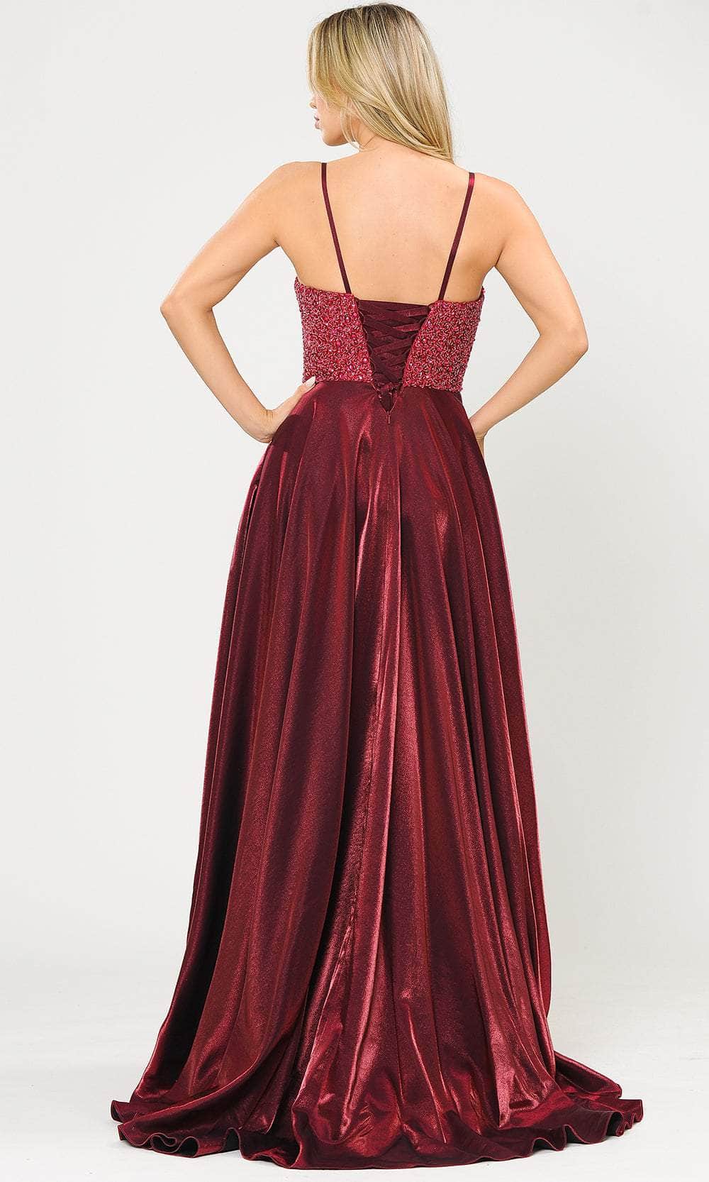Make a statement under the spotlight with this elegant Poly USA 8674 ensemble. Intricately adorned with shimmering embellishments intermingled along the bustier bodice, this gown features spaghetti straps cascading into a sweetheart neckline. Embellished with a midrise back boasting a lace-up design, the skirt unveils a pleated A-line silhouette with a trailing train. Step into a fashion statement that radiates sophistication and pure beauty with the Poly USA 8674 masterpiece. Models are wearing the Burgundy, Dark Silver, and Navy colors.