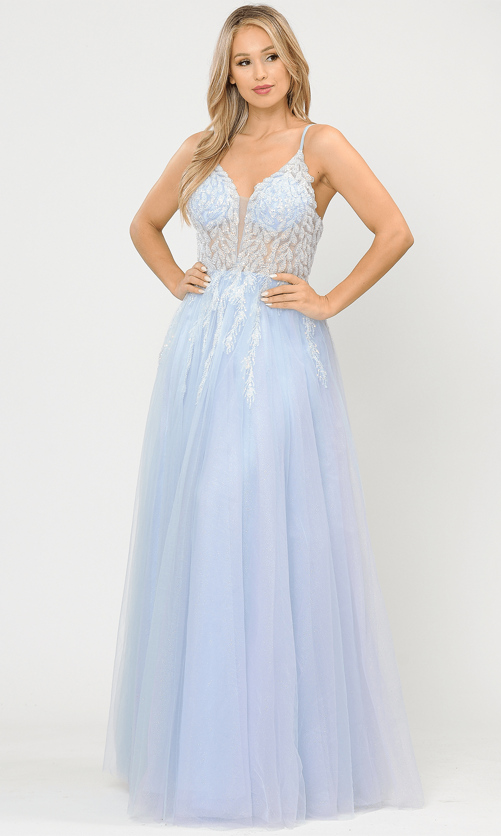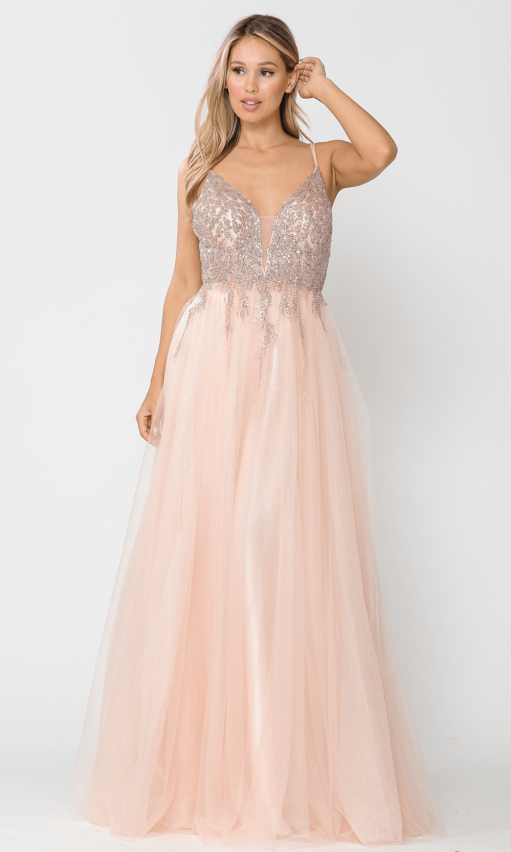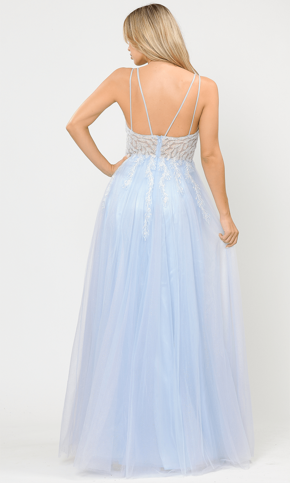 Steal the show in this dazzling dress by Poly USA 8718. The sheer bodice is adorned with sequins all over, creating a stunning and eye-catching effect. The dress is styled with double spaghetti straps and a low plunge sweetheart neckline that adds a touch of elegance and allure. The skirt is crafted from layers of tulle and cascades down in a flowing A-line silhouette that reaches all the way to the floor. Poly USA 8718 make you feel all royal and radiant looking. Models are wearing Blue, and Rose Gold colors.