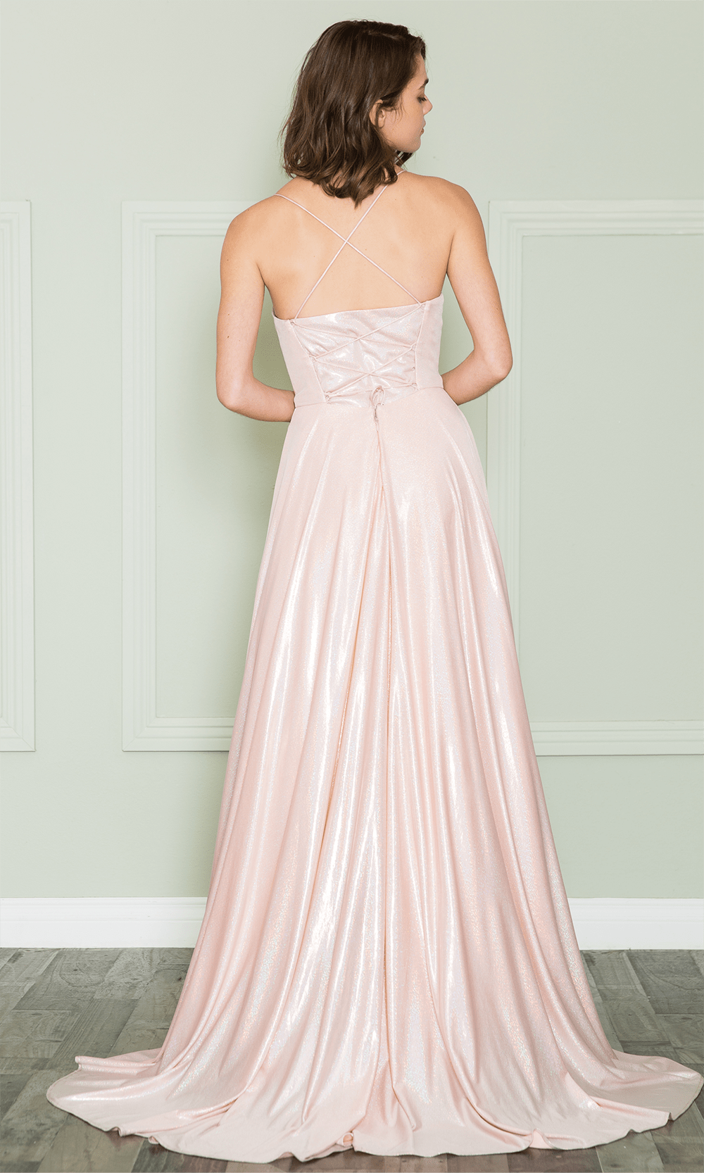 Look fresh and pretty in this dress by Poly USA 8766. With its iridescent fabric, fashioned into a scoop-necklined corset bodice with a pair spaghetti straps, you are sure to turn heads as you walk into the crowd. From its normal waistline drapes down an A-line silhouette skirt that reaches the floor in a sweep train at the hemline. At the back is a criss-cross lace-up design with a zipper for easier closure. Get noticed in this simple yet radiant Poly USA 8766. Models are wearing Blue, Silver, and Rose Gold colors.
