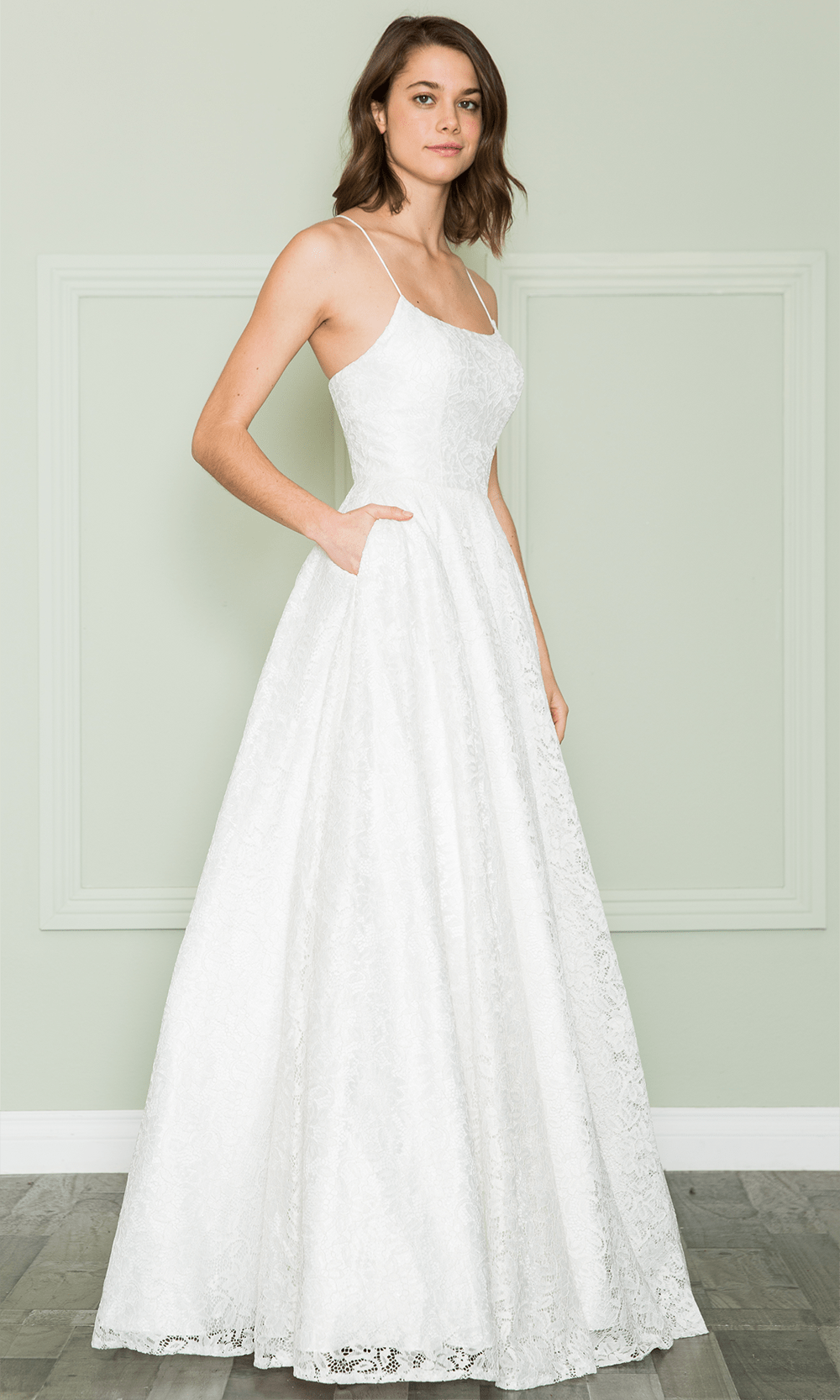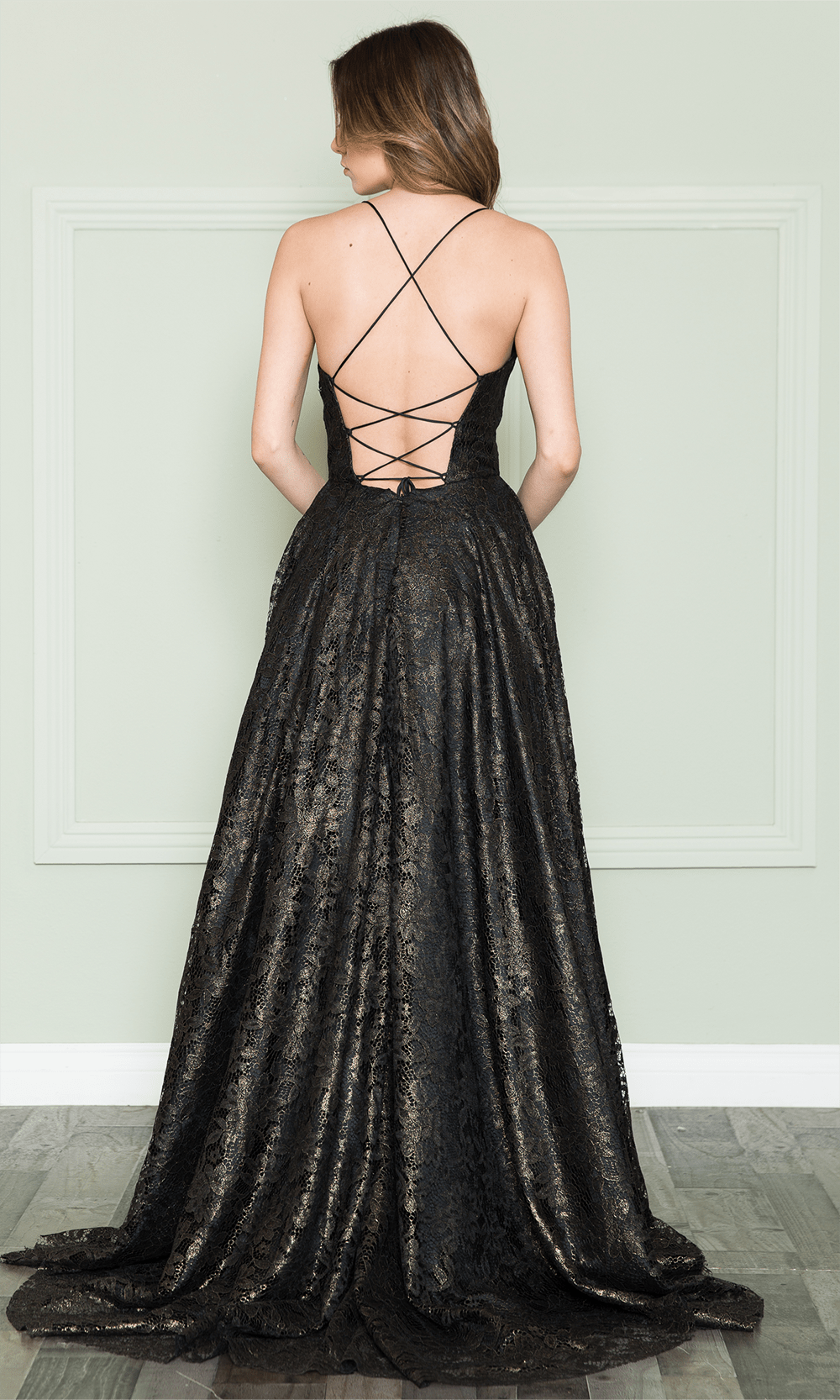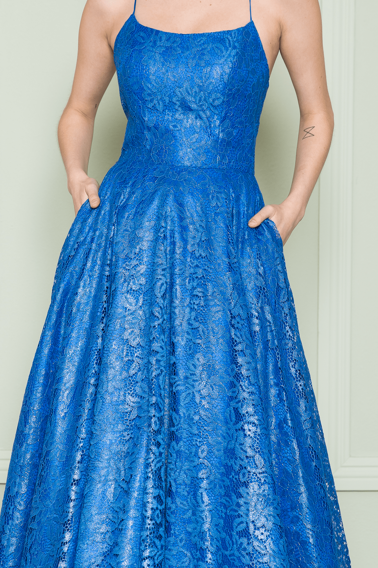 Radiate luxury and sophistication in Poly USA 8862. This sleeveless dress features a full lace A-line silhouette that is fitted to your curves for a look that is truly captivating. Finishing touches including spaghetti straps, a scoop neckline, corset closure and pocket detail add a unique charm that will exude elegance and refinement no matter where you go. Poly USA 8862 is the perfect choice for any formal occasion. Models are wearing the Off-White, Black/Gold, and Royal colors.