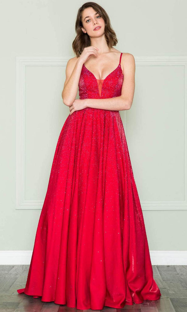 This stunning Poly USA 8888 gown will bring sophistication and elegance to any special event. Crafted from luxurious fabric embellished with rhinestone beadings, a deep V-neckline with sheer inset, and corset closure for a timeless, figure-flattering silhouette. Completing the look is a mid-open back, exaggerated with its long spaghetti straps, while its A-line silhouette and sleeveless style adds grace and refinement. Transform any occasion with this beautiful dress handmade with love and precision from Poly USA. Models are wearing the Red, Royal, Emerald, and Black colors.