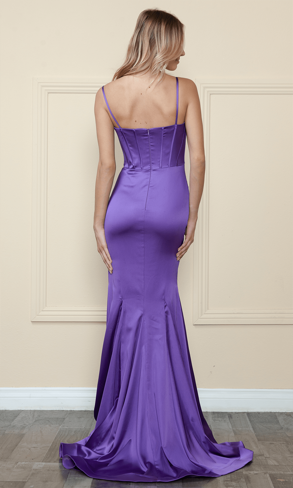 Enter the hall with grace and beauty in Poly USA 9008. This enchanting evening gown is designed to make a statement with its captivating corset bodice that accentuates the waistline and highlights the curves. The sweetheart neckline and slender straps showcase your natural beauty, while the basque waist adds an extra touch of elegance to the look. The mermaid silhouette is embellished with box pleats and finishes off with a dramatic sweep train, creating a truly majestic appearance. This Poly USA 9008 will definitely bring out the goddess in you! Models are wearing Fuchsia, Royal, and Purple colors.