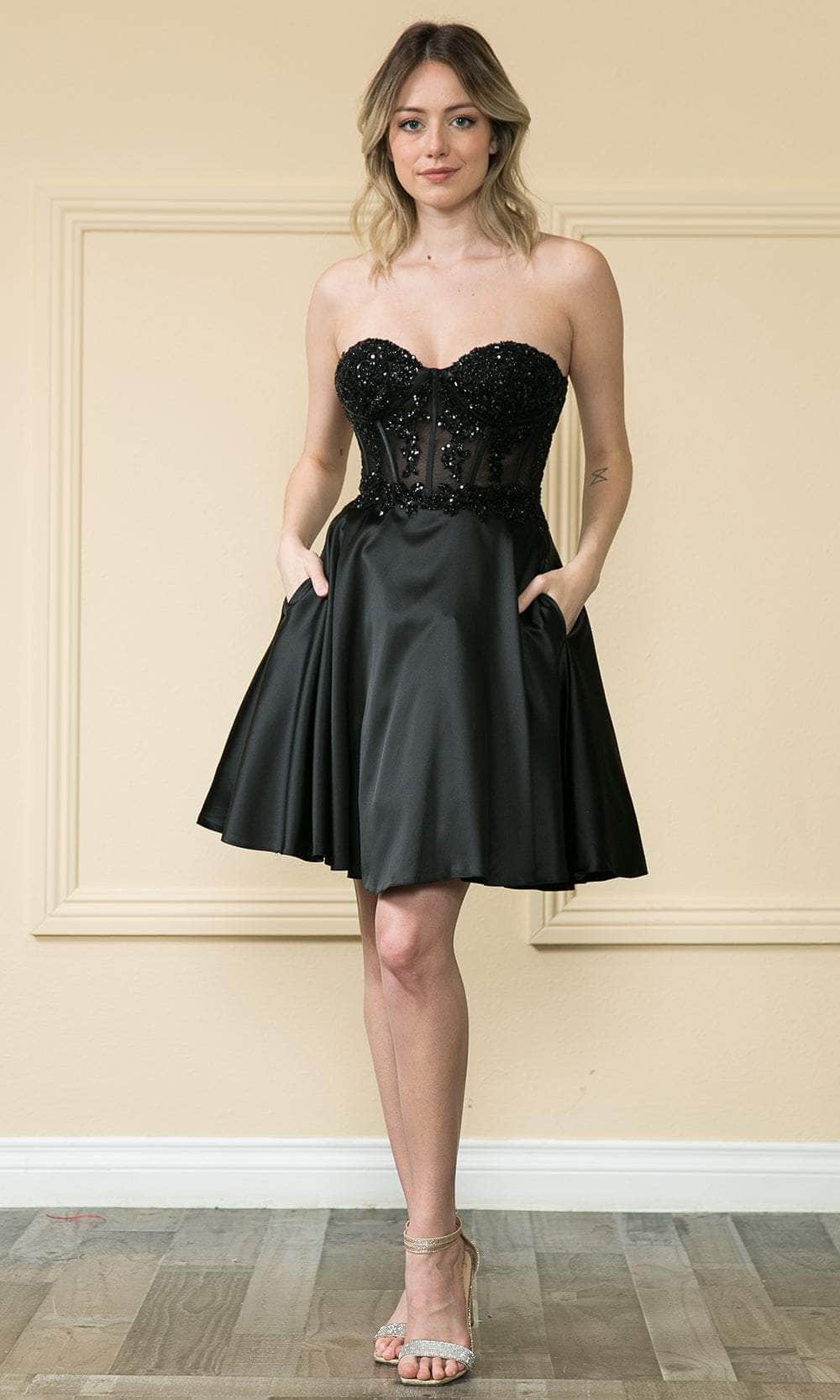 Fancy a romantic night of celebration in this elegant Poly USA 9084 creation. Ornamented with a beaded spectacle on a sheer corset boned bodice, this beauty perfects with a sweetheart neckline on a strapless silhouette. Crafted with a midrise back with a lace up detail, the sleek skirt softly flutters into a mini hemline. Don a style that have all eyes gravitate towards you in this Poly USA masterpiece. Models are wearing the Black, Champagne, Coral, Lilac and Navy colors.