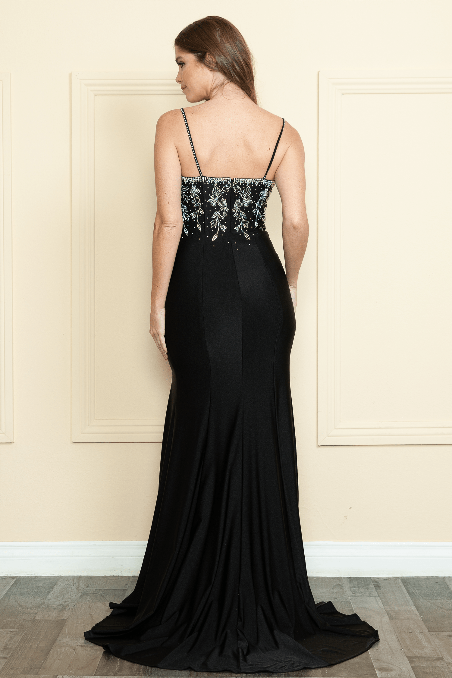 Radiate beauty in this chic Poly 9122 sheath dress adorned with vogue rhinestone embellishments, ensuring you become the center of attention. The dazzling rhinestone detailing on the bodice adds the perfect finishing touch, while the spaghetti straps and front slit imbue the dress with a soft, feminine allure. Meanwhile, the slit lends a touch of seduction and allows for ease of movement. The exposed back and sleeveless design draw attention to your shoulders and upper body. Adding to its allure, the sweep train trails behind you, imparting drama and elegance to your look. With a back zipper ensuring a snug and comfortable fit, be beautifully dressed up in Poly 9122! Model is wearing Black, Emerald, Raspberry and Royal colors.