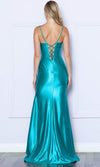 Elevate your evening with glamour and elegance in the Poly USA 9252 ensemble. Featuring sleek tailoring lines on a luxurious satin silhouette, this exquisite gown showcases spaghetti straps cascading into a plunging v-neckline adorned with an illusion inset. The lace-up detailed back adds a charming touch, while soft drapes accentuate the skirt, which boasts a daring high slit to showcase your legs. Complete with a trailing train that gracefully sweeps the floor, this captivating Poly USA 9252 masterpiece illuminates every occasion with sophistication. Models are wearing the Navy, Magenta, and Jade/Turquoise colors.