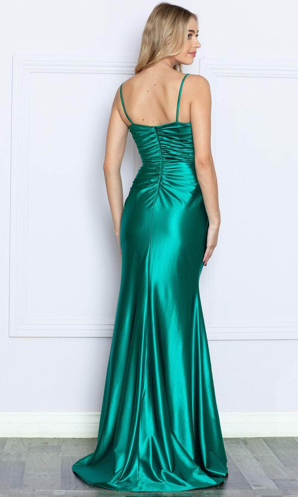 Indulge in the height of sophistication with the opulent Poly USA 9254 ensemble. Adorned with pleated drapes along the bodice, this exquisite gown features spaghetti straps cascading delicately into a sweetheart neckline adorned with lace appliqued peekaboo detail. Embellished with glinting rhinestones, the midrise back boasts fine ruching and a concealed zipper closure. The mermaid skirt, accentuated with drapes and a seductive slit, sculpts and flares to create a sweeping denouement. Radiating sophistication, this captivating Poly USA 9254 masterpiece is perfect for illuminating any occasion. Models are wearing the Emerald, Royal, and Red colors.