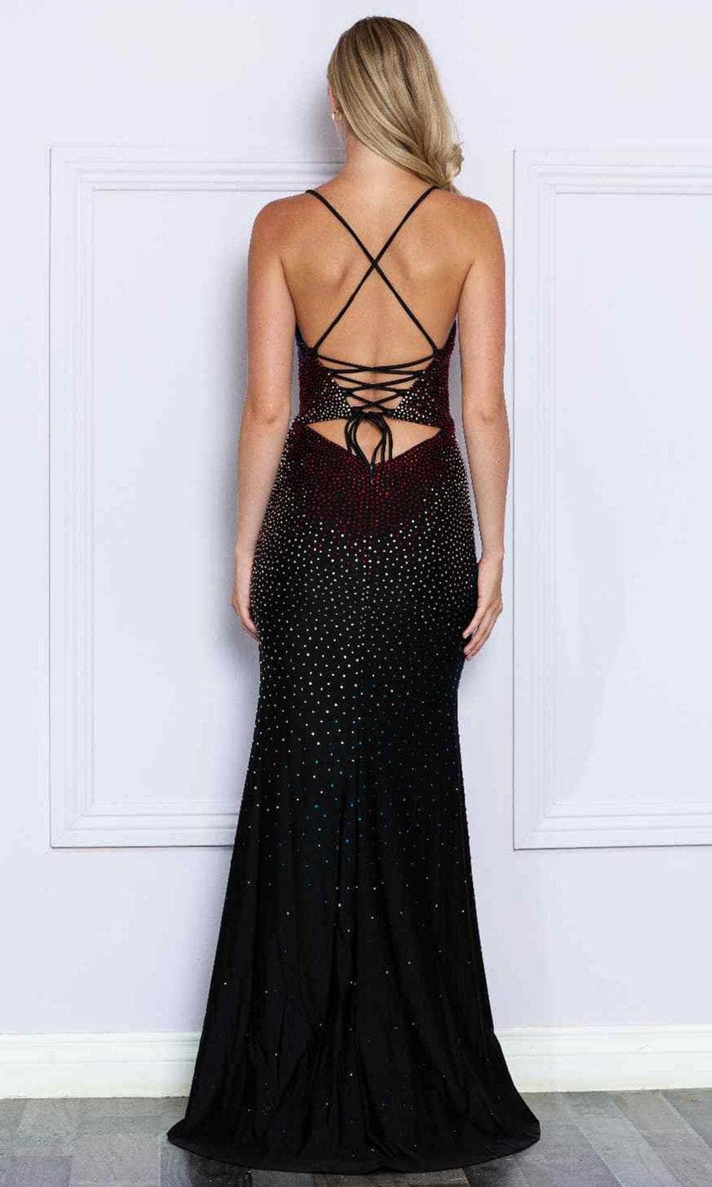 Make a statement with this Poly USA 9272 creation. A beautiful glimmer of color and texture permeates this sleeveless dress, which is adorned completely in diagonal multicolored beadings. It features a low v-neckline, natural waist and spaghetti straps. The open back adds an unexpected twist with its cutout design and crisscross lace-up closure. The skirt elegantly drapes to the floor and sweeping train, creating a fitted sheath silhouette. The Poly USA 9272 masterpiece is ideal for enjoying a night filled with dancing. Model is wearing Black/Multi color.