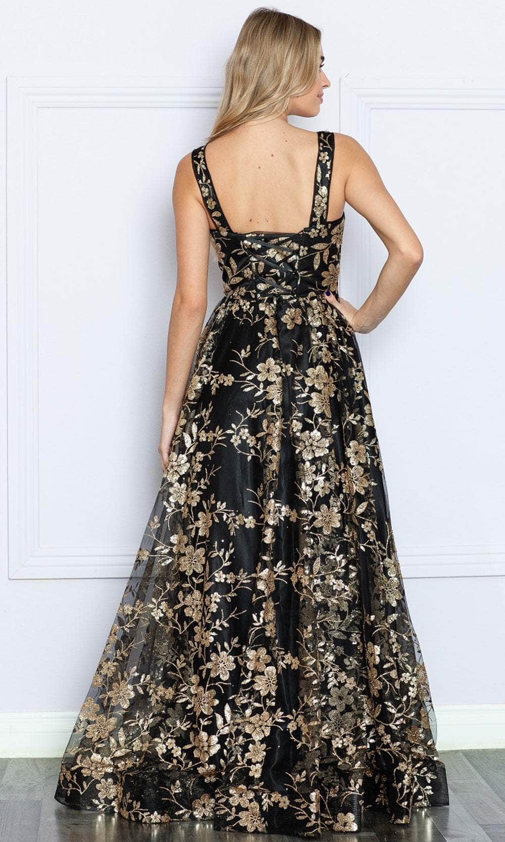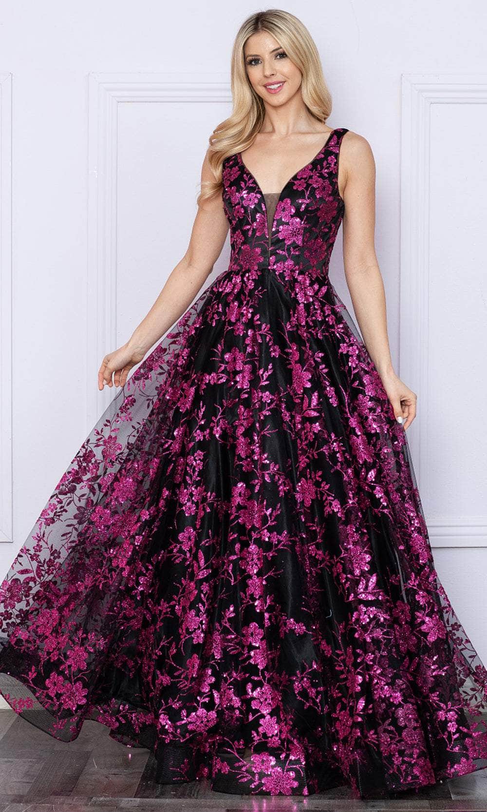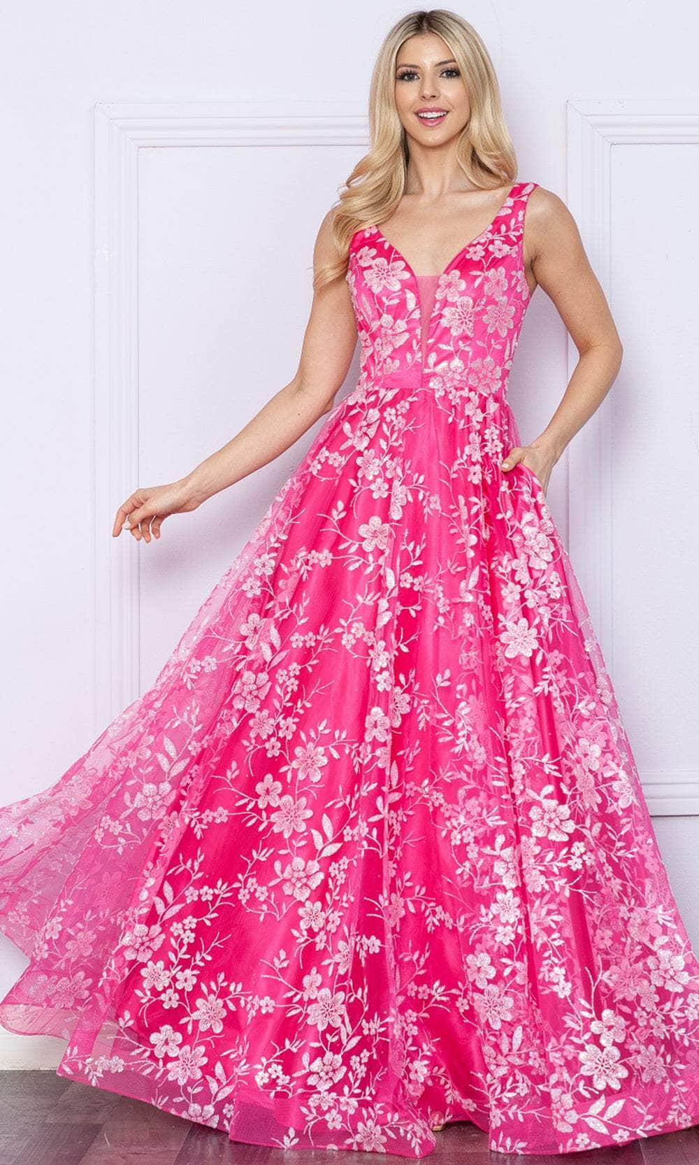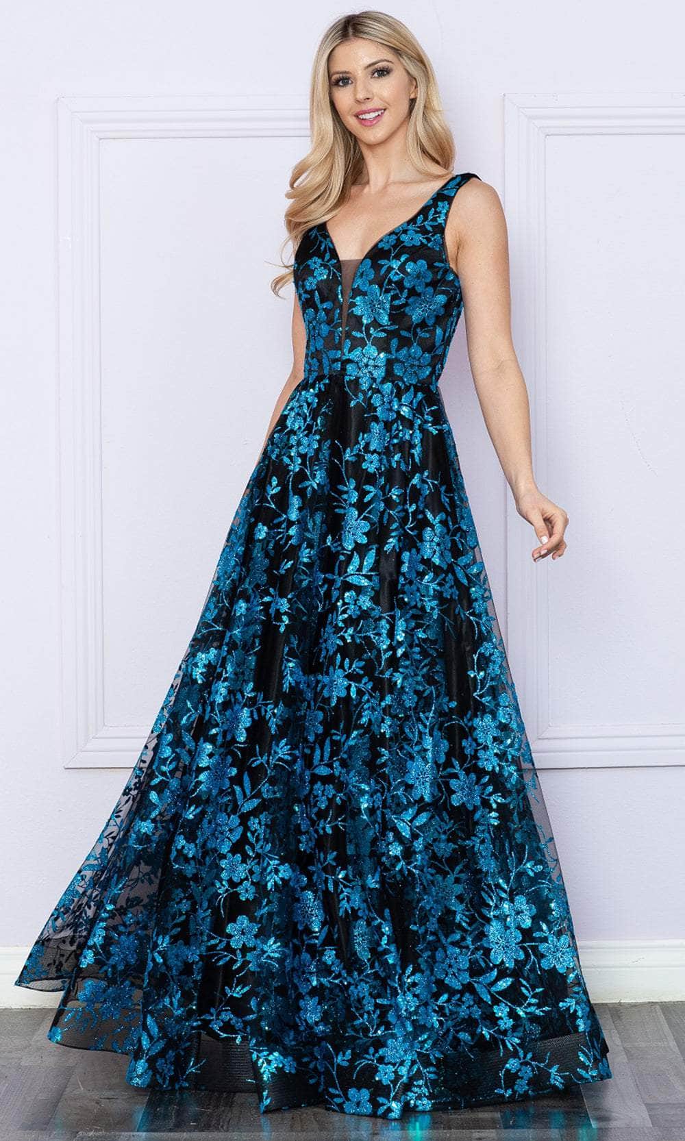 Immerse yourself in the luminous sparkle and graceful femininity of the Poly USA 9298 ensemble. Adorned with floral embellishments enhanced by glimmering accents, this gown features a sleeveless bodice boasting a v-neckline and a subtle tonal illusion inset. The square open back is elegantly cinched with a lace-up design, adding allure to its appeal. Delicately styled with floral motifs, the skirt cascades into a sweeping finale. Luxuriate in the shimmering radiance and feminine charm embodied by this Poly USA 9298 masterpiece. Models are wearing the Black/Rosegold, Black/Turquoise, Black/Magenta, and Hotlink/White colors.