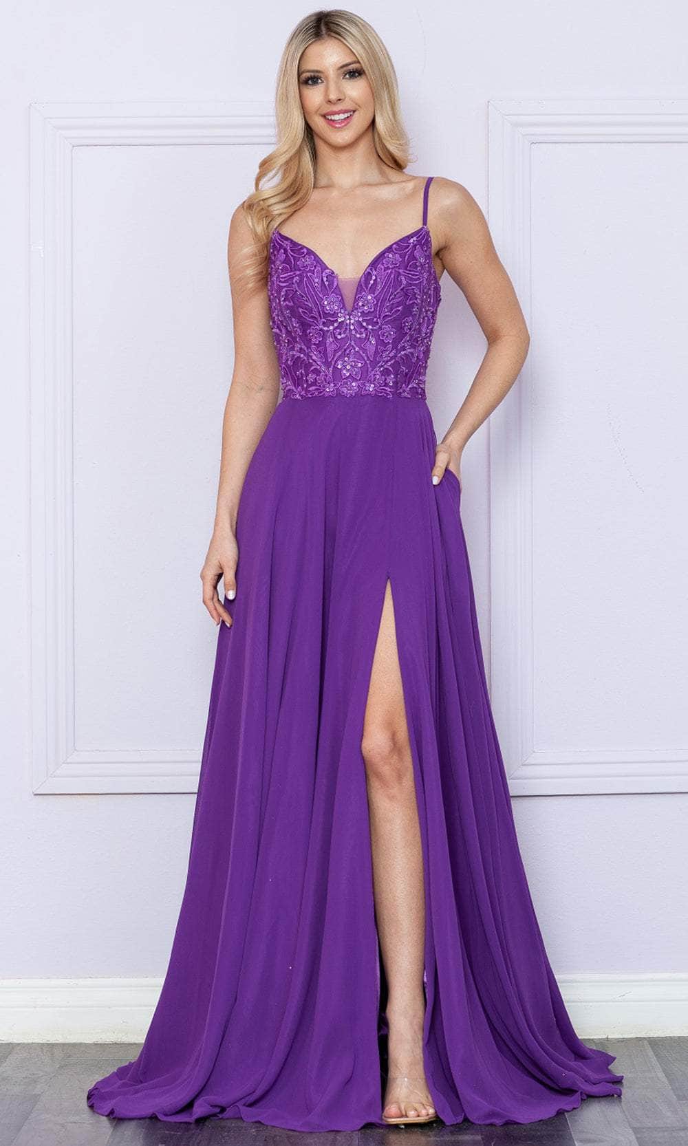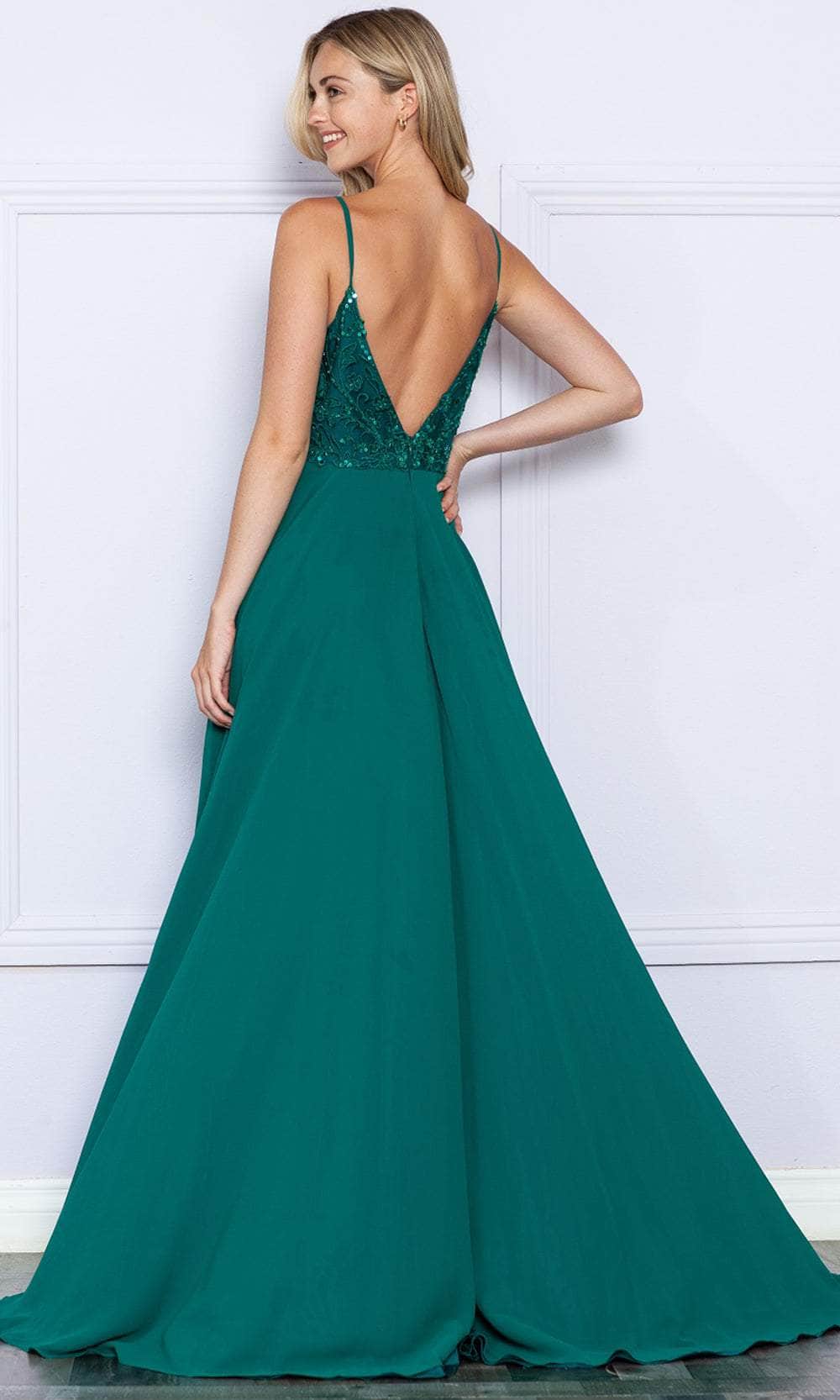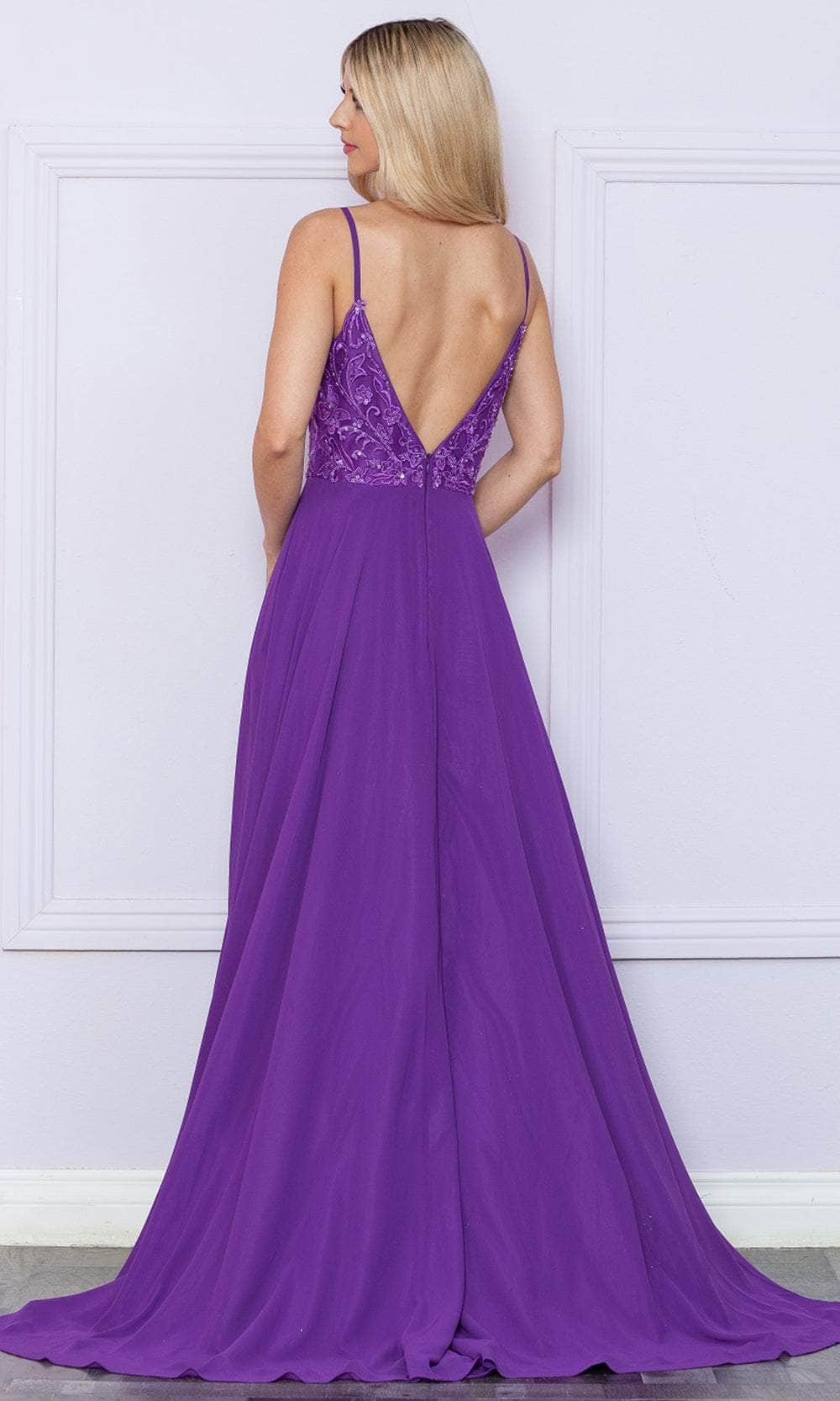 Leave a long-lasting impression as you walk by in this Poly USA 9368 creation. Bedecked with glittery sequin embroidery, this outfit exudes sophistication and grace. Shown are the deep v-neckline string by the spaghetti straps, while the illusion inset detail at the bust adds a touch of allure. A hidden zipper closure at the plunging v-back, promises a seamless fit. The A-line skirt is flowy, and reveals pockets on the side to keep your stuff safe. Complete with a thigh-high slit and sweeping train for dramatic flair. This Poly USA 9368 masterpiece is truly amazing! Models are wearing Emerald, Navy, and Purple colors.