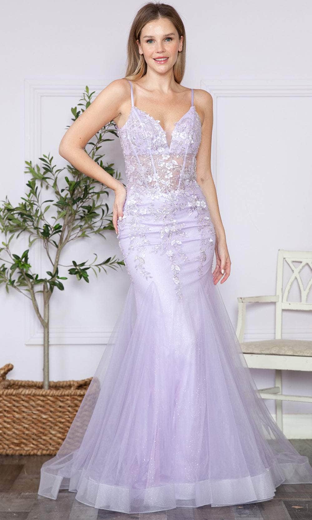 Embrace your inner fashionista in this masterpiece from Poly USA 9374. This sleeveless ensemble is ornamented with glistening beadwork and floral lace appliques. It is held in place by spaghetti straps that fall and transition into a strappy lace-up design at the open back. The deep v-neckline and see-through corset boning bodice offer a touch of allure. The mermaid skirt godets accent and horsehair hem, adds just the perfect amount of glam. This Poly USA 9374 creation is jaw-dropping for your special occasion. Models are wearing Blue, Lavender, and Pink colors.