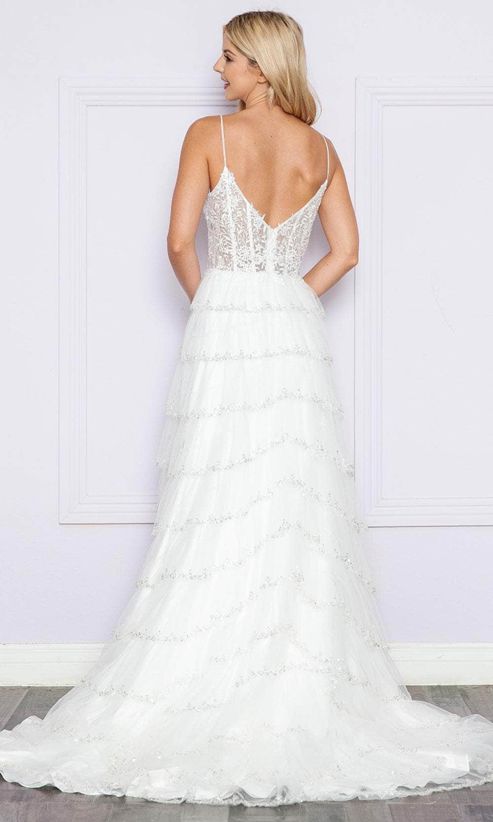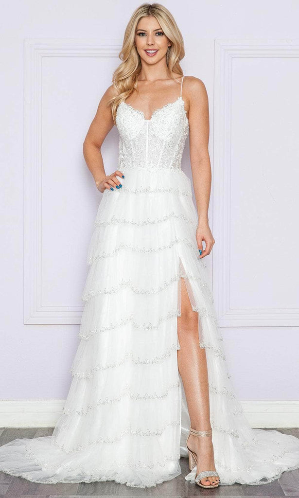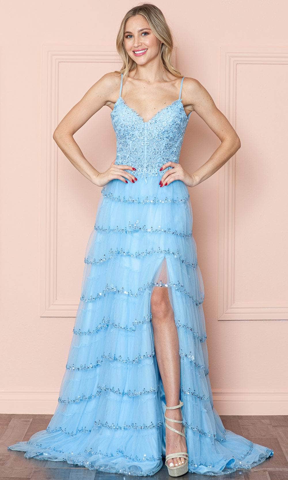 Captivate attention all evening in this creation from Poly USA 9404. This outfit is bedecked with glittering beads, elevated by the lace appliques on the sheer corset boning bodice. The spaghetti straps offer support to the v-neckline and V-shaped open back. A stunning A-line skirt highlights the tiered design and sexy thigh-high slit. Complete with the sweeping train that exudes red-carpet appeal. This Poly USA 9404 dress combines all the essentials for a fantastic appearance at prom or party! Models are wearing Black, Off-White, and Blue colors.
