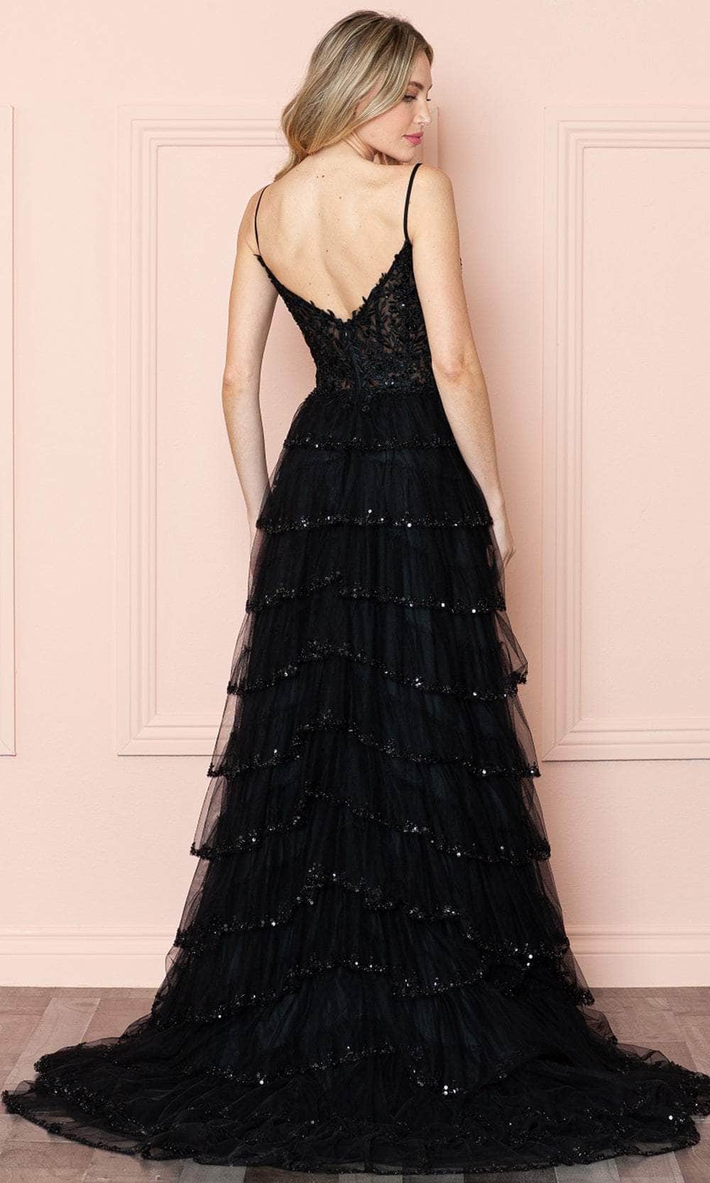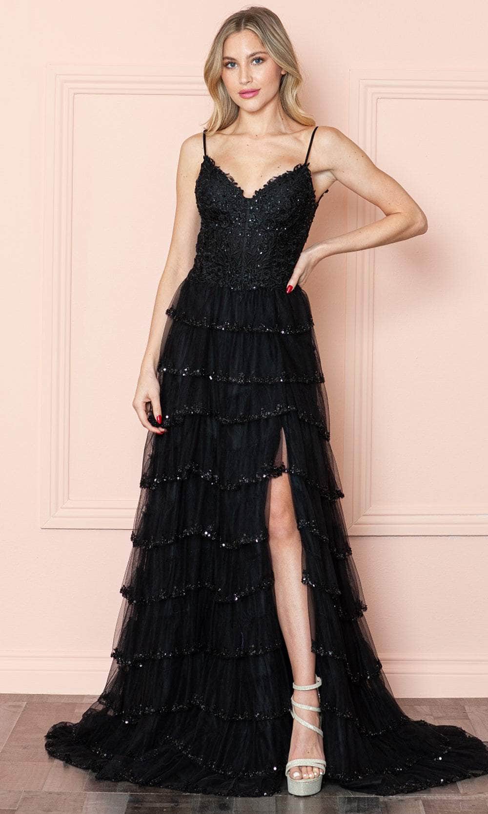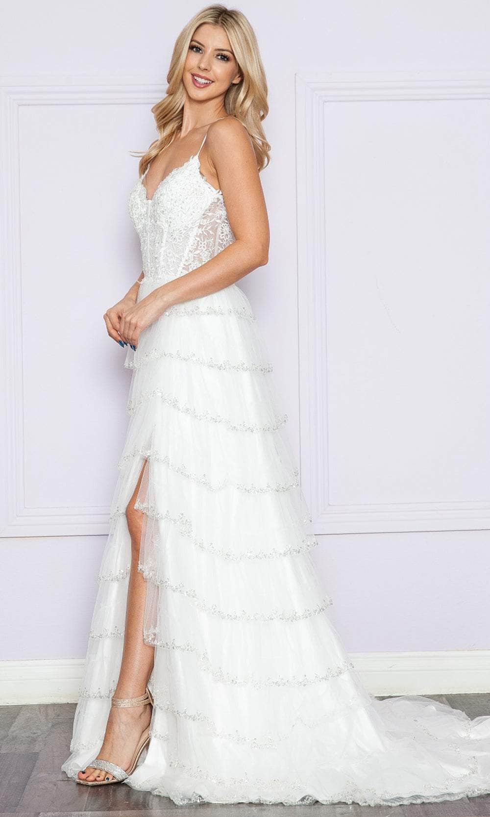 Captivate attention all evening in this creation from Poly USA 9404. This outfit is bedecked with glittering beads, elevated by the lace appliques on the sheer corset boning bodice. The spaghetti straps offer support to the v-neckline and V-shaped open back. A stunning A-line skirt highlights the tiered design and sexy thigh-high slit. Complete with the sweeping train that exudes red-carpet appeal. This Poly USA 9404 dress combines all the essentials for a fantastic appearance at prom or party! Models are wearing Black, Off-White, and Blue colors.