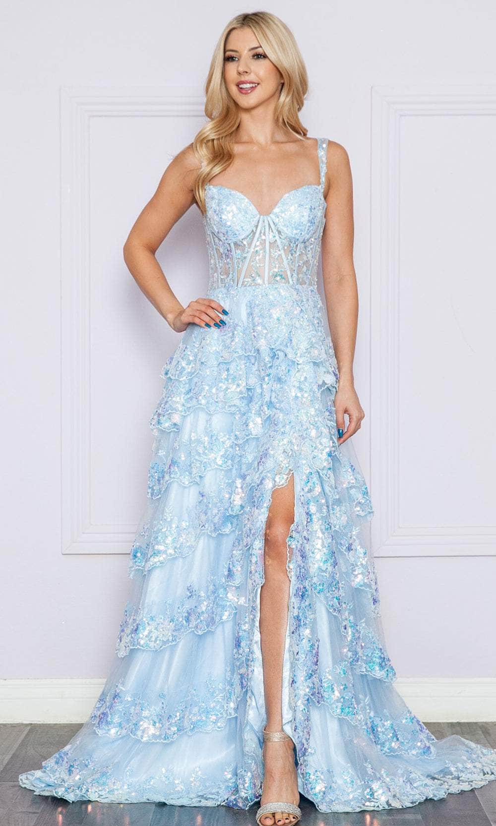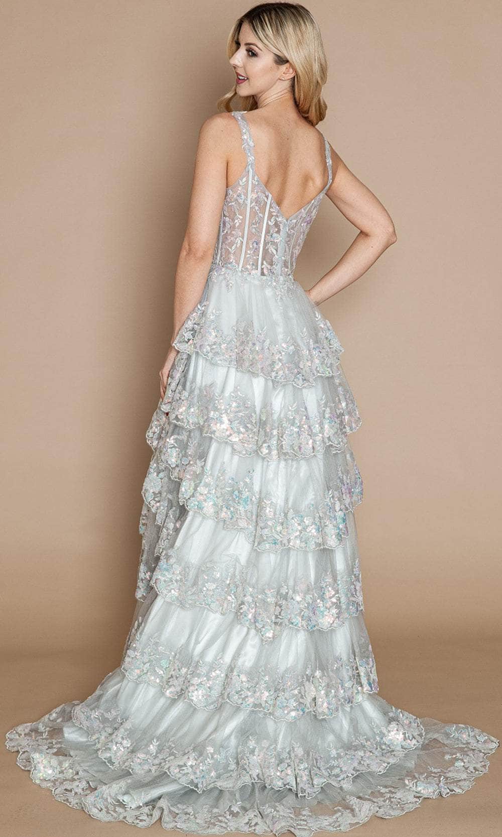 Mesmerize everyone with the romantic flair and style of this Poly USA 9410 creation. Tantalizingly ornamented with glimmering embellishments mingling with embroidered lace details, this gown flaunts tank straps trailing into a sheer corset bodice. Detailed with a sheer back with a v-style and a concealed zipper closure, the tiered skirt reveals an A-line silhouette with a train spill. Enter a fashion statement that exudes both sophistication and sheer beauty with the Poly USA 9410 masterpiece. Models are wearing the Blue, Silver, Blush, and Light Green colors.