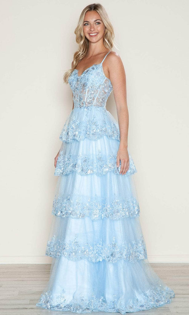 Make your grand entrance in this Poly USA 9548 gown. This stunning masterpiece is crafted from mesh lace fabric and adorned with sparkling sequins, creating a captivating look. The sleeveless sheer corset bodice is crowned with a sweetheart neckline and supported by delicate spaghetti straps, enhancing its romantic charm. A back zipper closure ensures a perfect fit. The floor-length skirt parades in an A-line silhouette, accented with ruffles that add volume and movement. Concluding with a graceful train, this Poly USA 9548 is ideal for formal events, exuding both sophistication and modern allure. Models are wearing Blush and Blue colors.