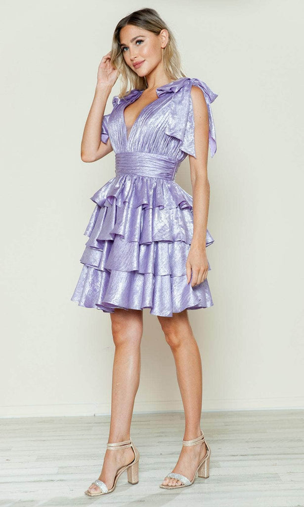 Steal the spotlight in the stunning Poly USA 9602 creation. This piece features a sleeveless design with wide shoulder straps adorned with bow details. The ruched bodice and wide waistband beautifully accentuate your figure, while the plunging V-neckline and matching low V-back add a touch of allure. The short skirt flares into a playful A-line silhouette with dramatic ruffled tiers, making it perfect for dancing the night away. Embrace your feminine charm in the Poly USA 9602 cocktail dress. Models are wearing Bronze, Lavender, Magenta, Royal, and Silver colors.