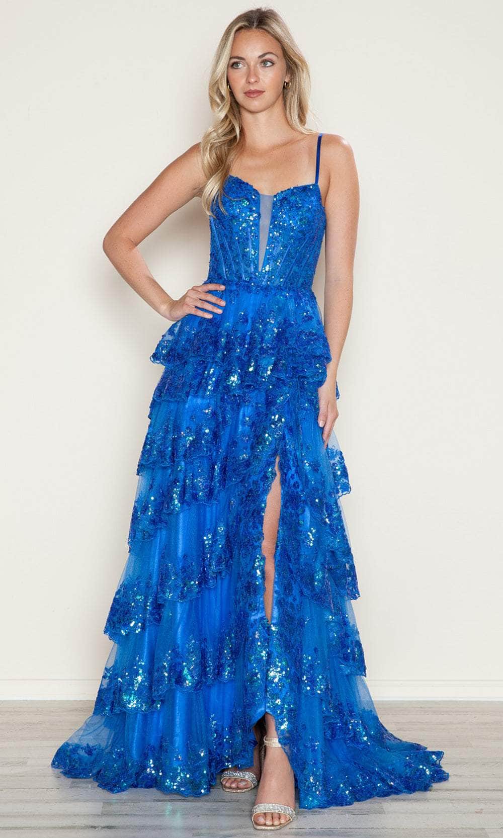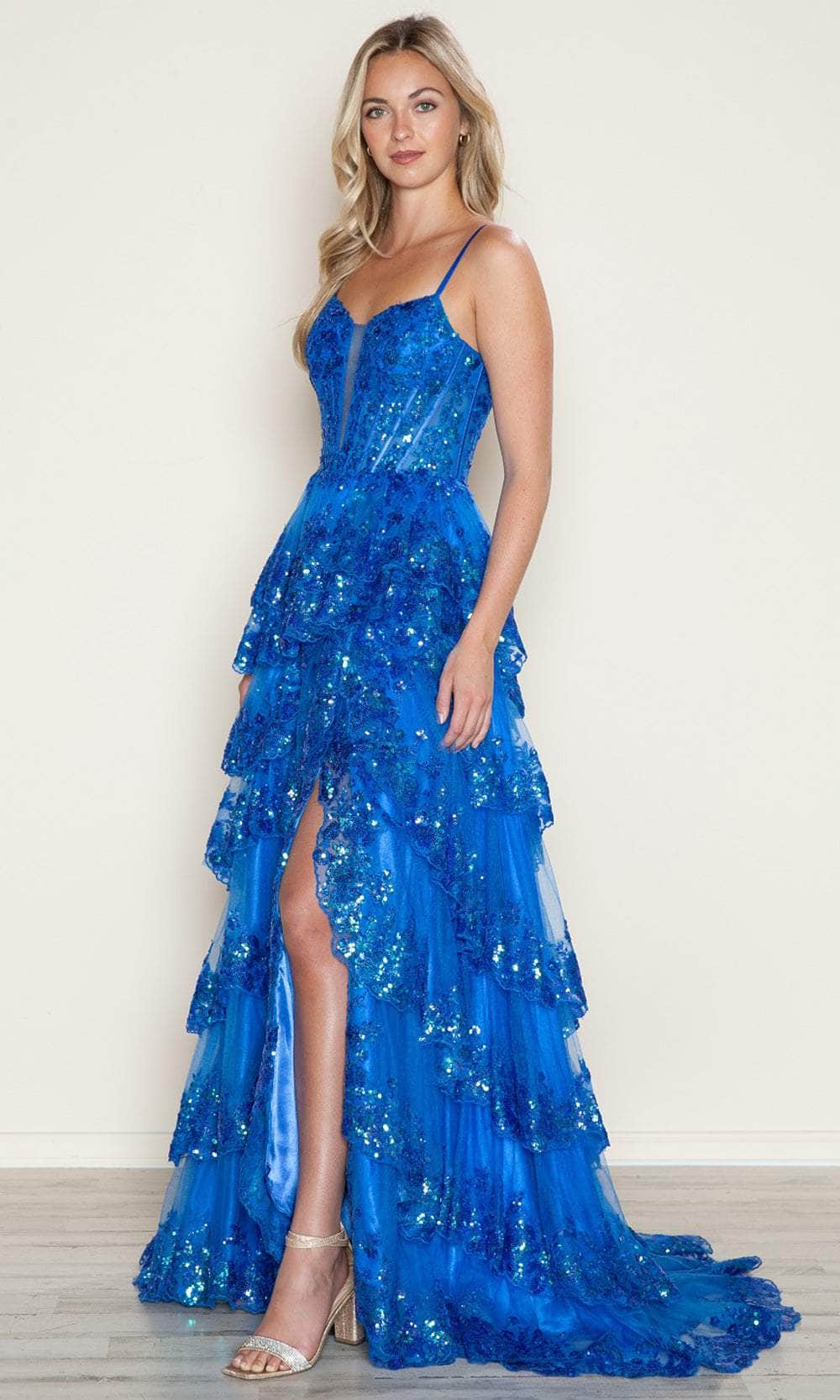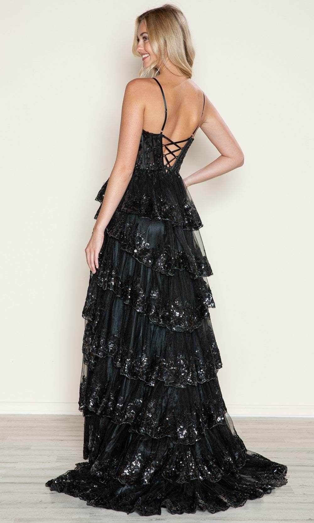 Elevate your look and capture all eyes in the Poly USA 9606 masterpiece. Opulently ornamented with sequins and lace appliques, this sleeveless style shows a plunging v-neckline on the corset boning bodice. The spaghetti straps elegantly outline the shoulders, transitioning into a lace-up tie closure that can be adjusted at the open back. The A-line skirt is adorned with tiered ruffles and scalloped edges, creating a dramatic volume that cascades beautifully to a sweeping train. Make a radiant entrance in this exceptional dress from Poly USA 9606. Models are wearing Black, and Royal colors.