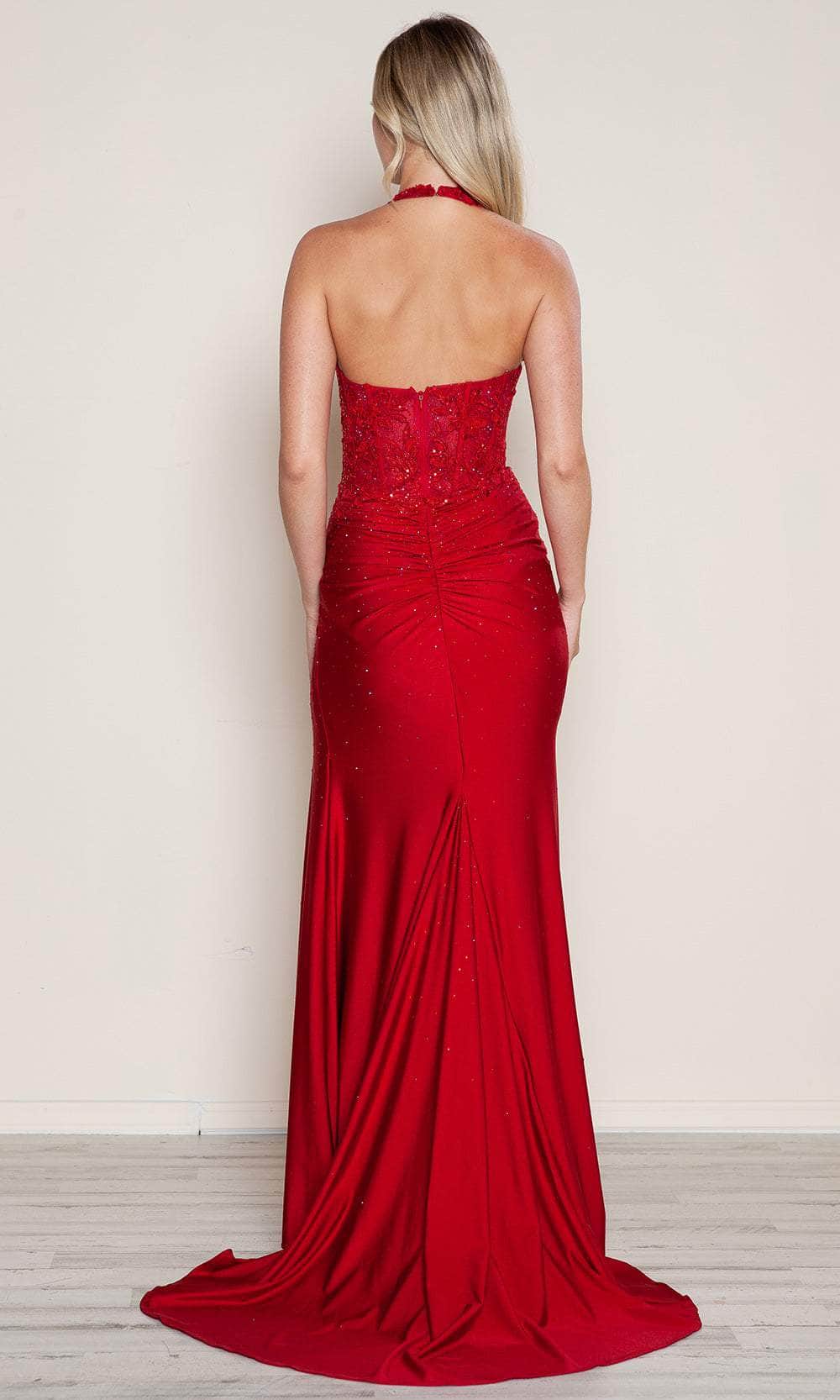 Unveil your captivating charm in this Poly USA 9614 statuesque dress. The dress is adorned with sparkling beads and features a corset-boned bodice detailed with embroidery, making it exceptionally eye-catching. A tantalizing plunging v-neckline, low open back, and sleeveless design are also highlighted. The wrap-style skirt reveals a sexy thigh-high slit on the side, forming an exquisite sheath silhouette that cascades into a sweeping train. Complete with ruched design that brings texture and elegance. Feel like a true queen in the Poly USA 9614 masterpiece. Model is wearing Red color.