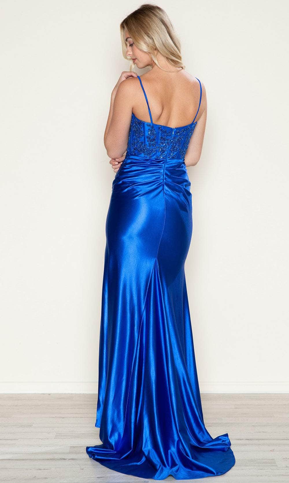 Step into sophistication with the Poly USA 9616 gown. This stunning sleeveless dress features a corset bodice with delicate spaghetti straps, creating a chic and flattering silhouette. The sheer insert adds a touch of allure, while the back zipper closure ensures a perfect fit. The gown is adorned with a godet and slit, adding movement and a dramatic flair to the design. The train completes the look with elegance, making it ideal for prom, evening events, or any formal occasion. Make a stylish entrance Poly USA 9616. Models are wearing Black, Emerald, and Royal colors.