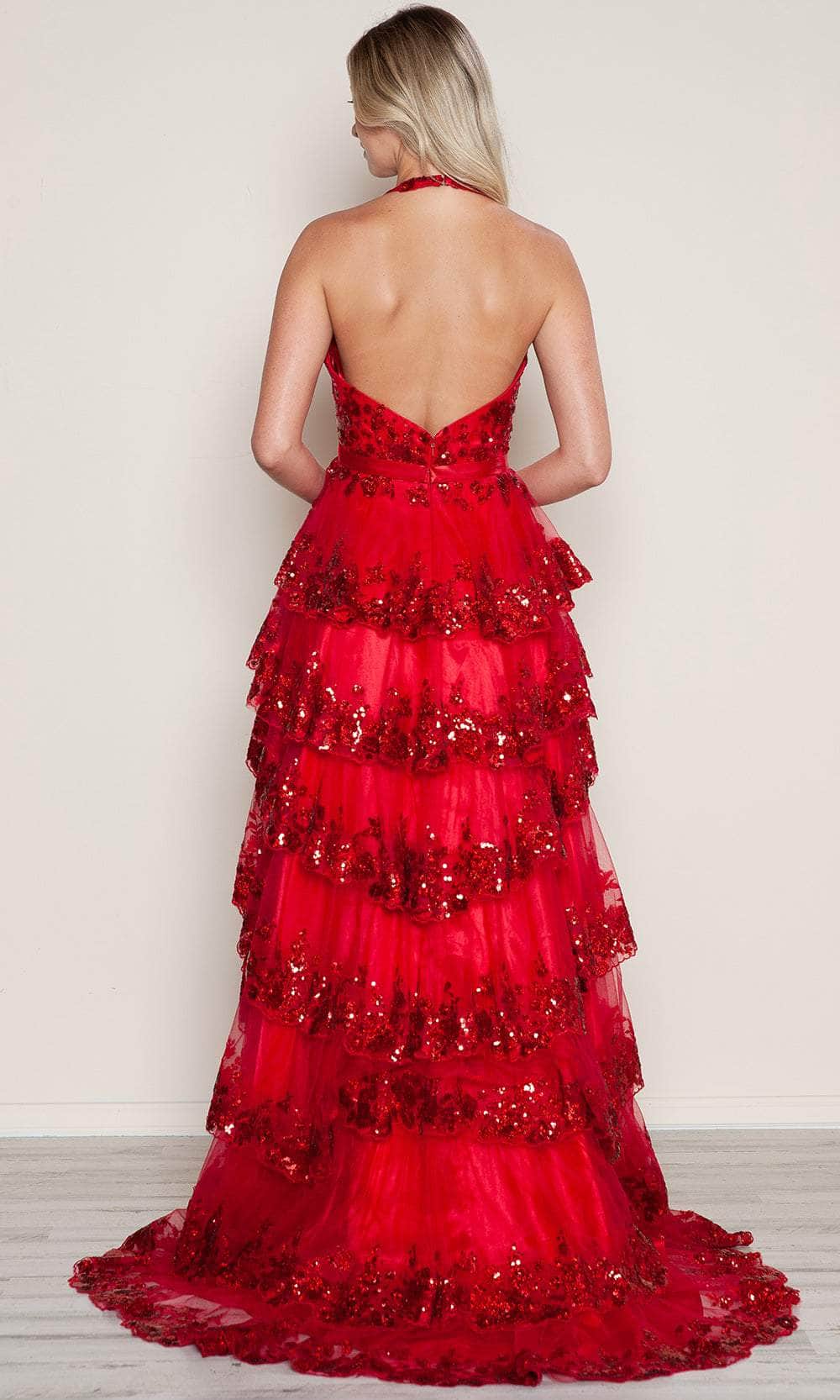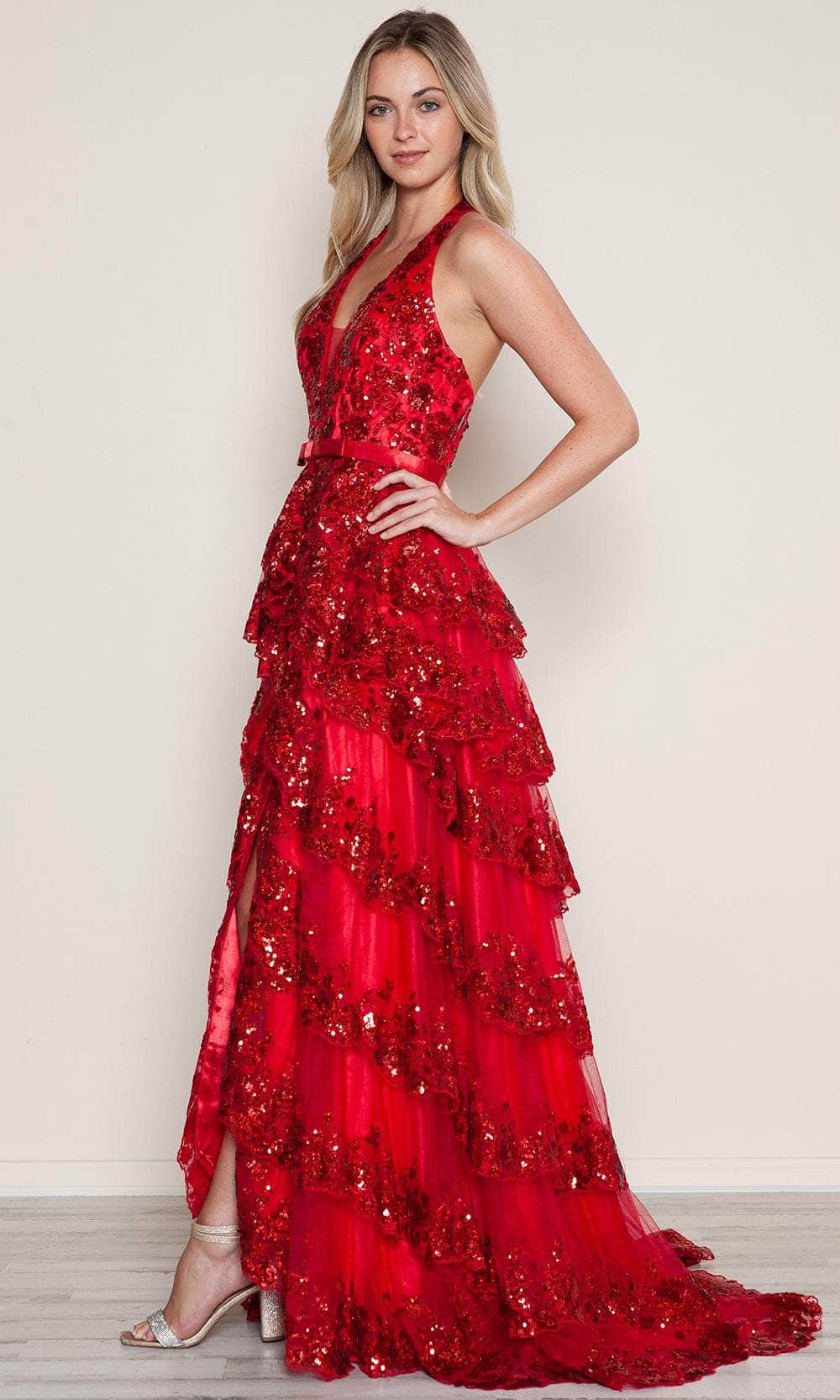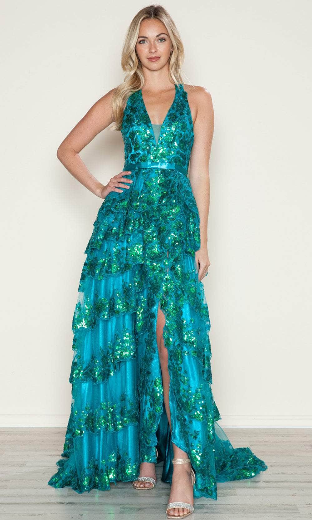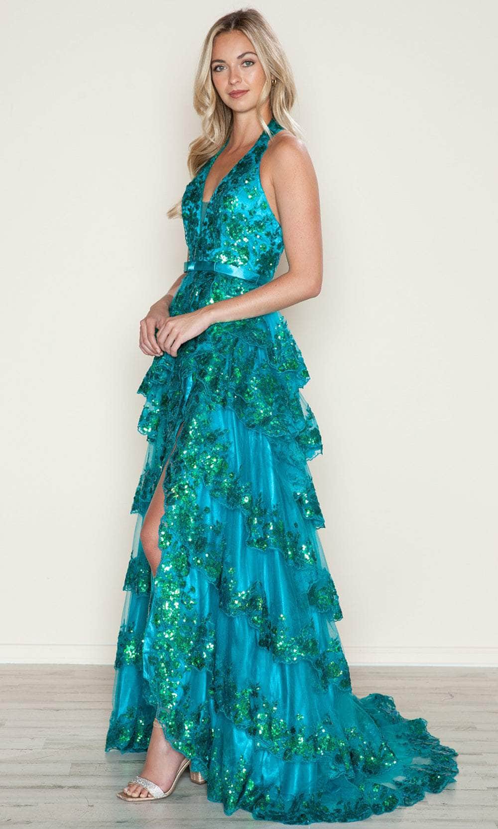 Sparkle and make an unforgettable impression by wearing the Poly USA 9618 creation. The sleeveless outfit embellished with intricate shimmering sequins and embroidery lend an air of opulence. A plunging V-halter neckline enhances your decolletage, and the backless design is bound to take the crowd breath away. The thin belt cinches the waist, giving you a beautifully slimming effect. Dramatically detailed with tiered ruffles and scallop edges, the skirt flares out an A-line silhouette that reaches the sweeping train. The thigh-high slit in the front beautifully elongates your legs while offering ease of movement. Heighten your charming appeal in the Poly USA 9618 masterpiece. Models are wearing Black/Gold, Red, Royal, and Teal colors.
