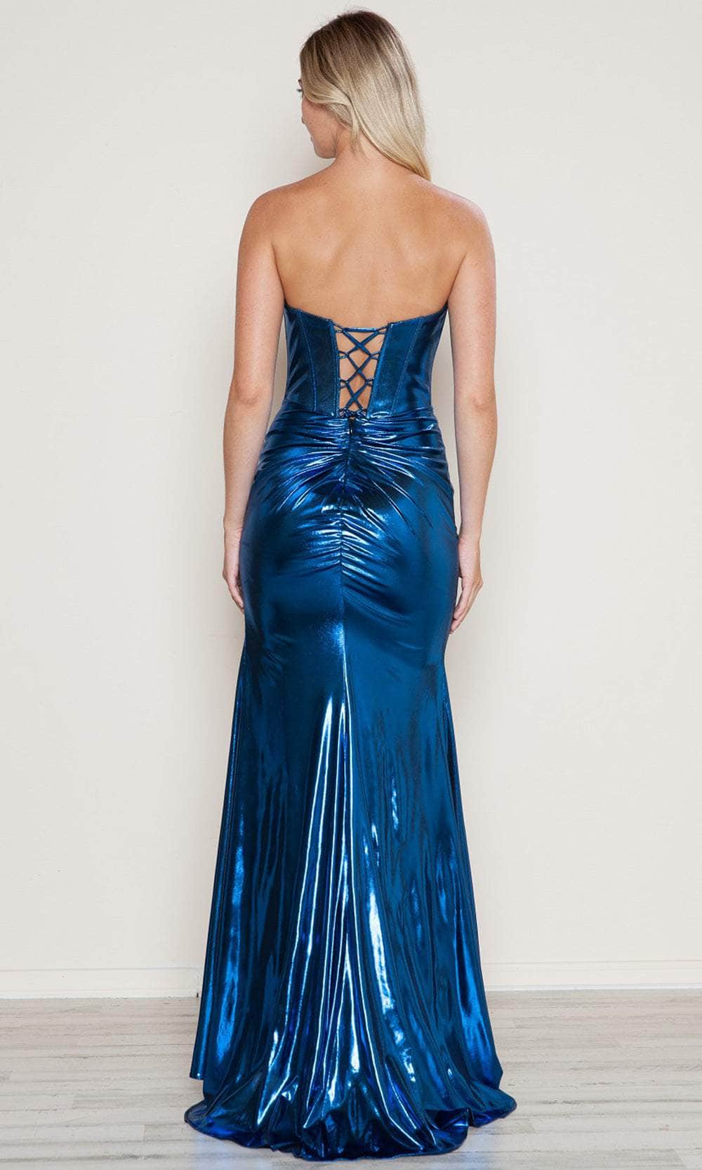 Elevate your elegance with the Poly USA 9684 gown. This exquisite dress features a strapless corset bodice with a sheer insert at the center front, complemented by a sweetheart neckline that exudes sophistication. The lace-up back ensures a perfect fit, enhancing the overall silhouette. The floor-length skirt parades in a sheath silhouette, accented with a high slit for added allure and movement. The Poly USA 9684 concludes with a graceful train, making it ideal for formal events where you wish to make a memorable entrance. Models are wearing Black, Gold, and Peacock colors.