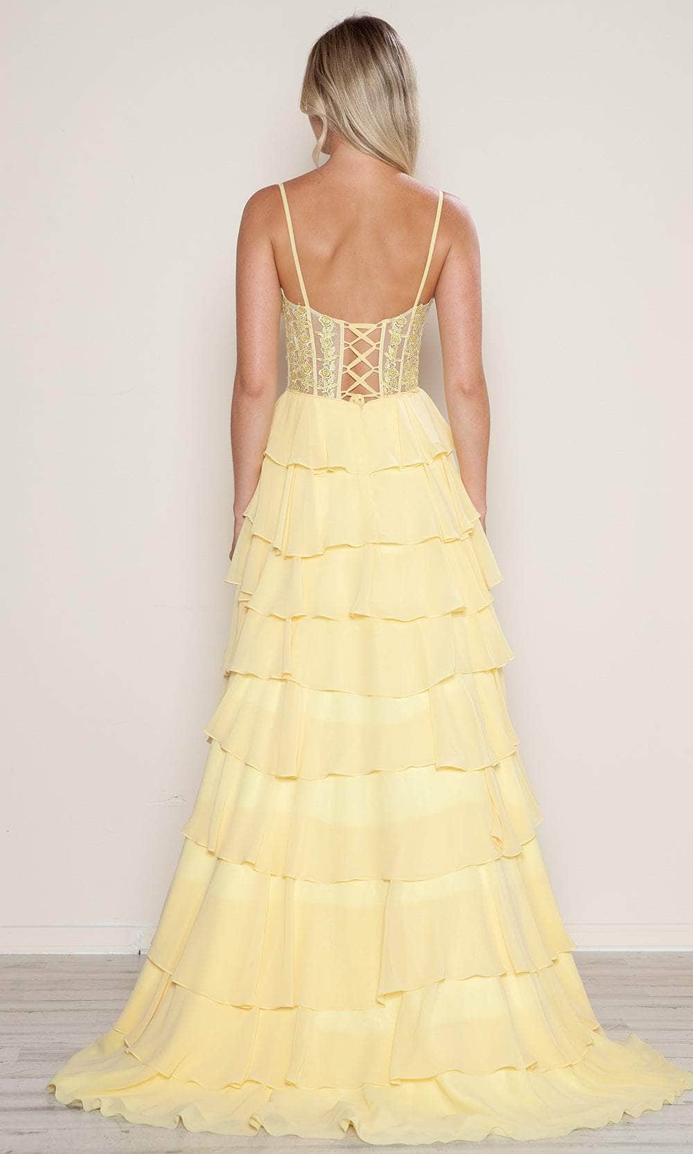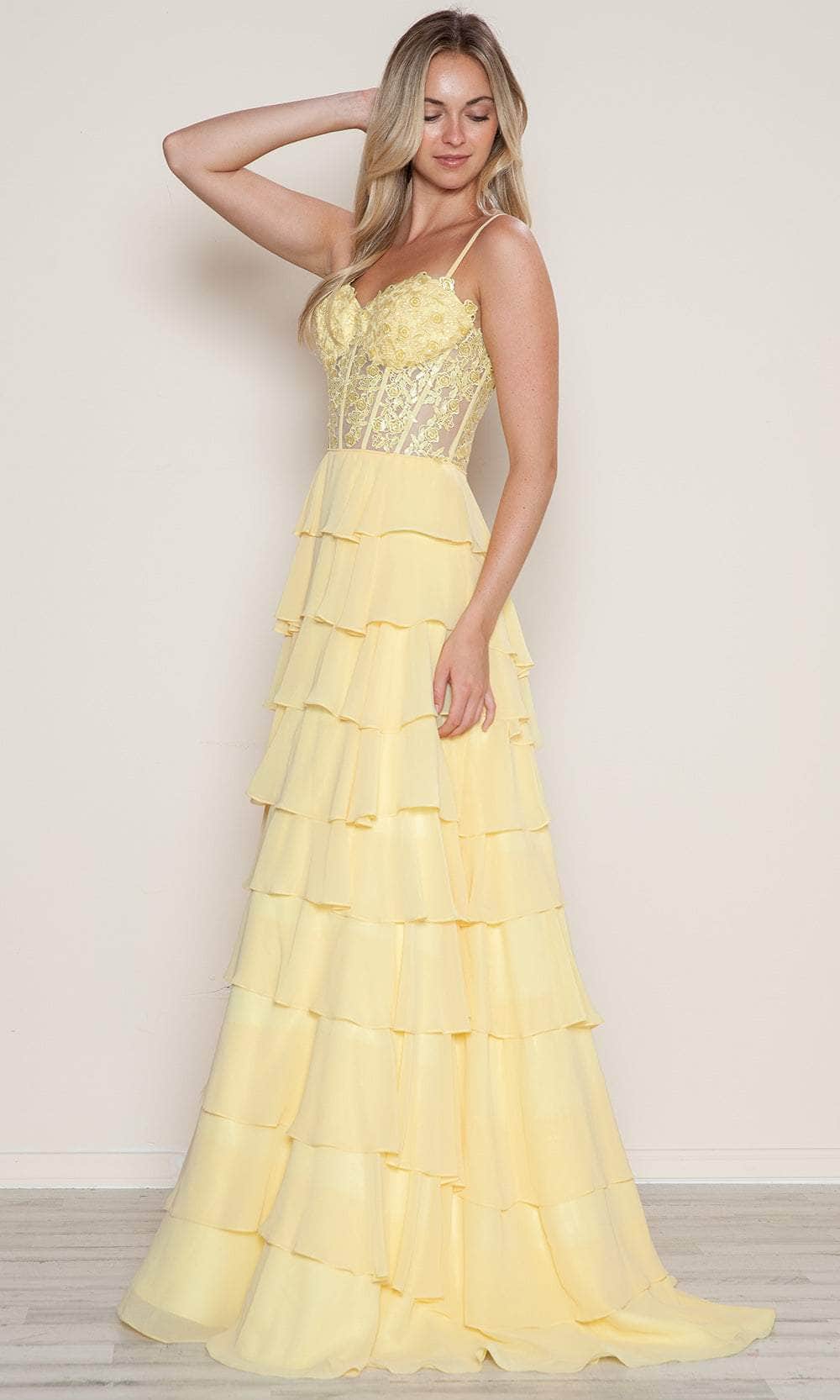 Walk into the hall with poise and charm in the Poly USA 9698 masterpiece. This design is undeniably a standout creation, featuring an illusion corset bodice adorned with embroidery in floral motifs. The sweetheart neckline is beautifully supported by spaghetti straps, lending a touch of feminine allure to the sleeveless silhouette. The open back is fastened by adjustable lace-up detail for a perfectly tailored fit. The full-length skirt widens in an A-line silhouette with tiered ruffles for added drama and graceful movement. This Poly USA 9698 prom dress is sure to create a memorable impact. Model is wearing Yellow color.