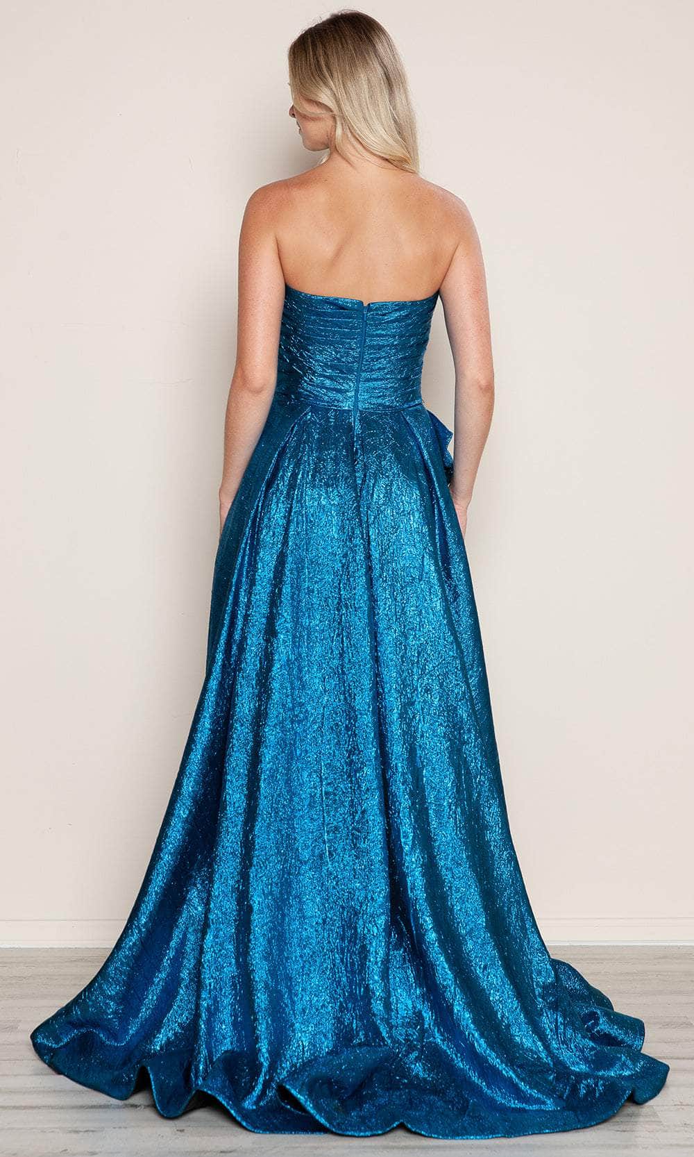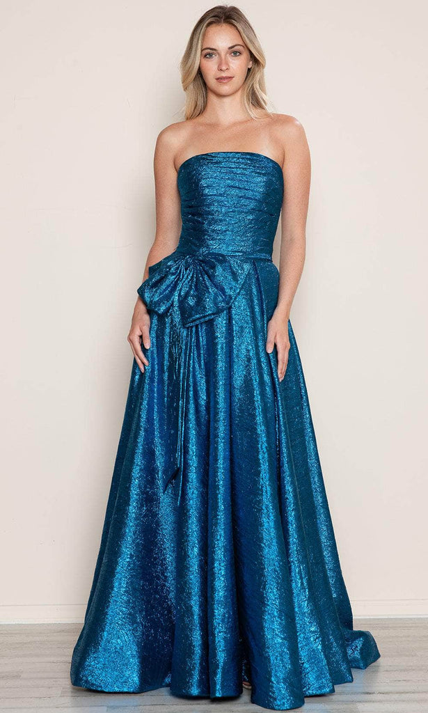 Be captivated by the breathtaking beauty of the Poly USA 9720 masterpiece. Made from shimmering taffeta, this strapless dress exudes the charm of modern luxury. The ruched on the top bodice beautifully introduces texture and enhances the overall design. Additional features are a chic straight across neckline paired with a mid-open back, and a statement bow accent at the side waist. The A-line skirt unveils a box pleated detailing and flows effortlessly into a regal sweep train. Be the star of the prom night in the Poly USA 9720 long dress. Model is wearing Peacock color.