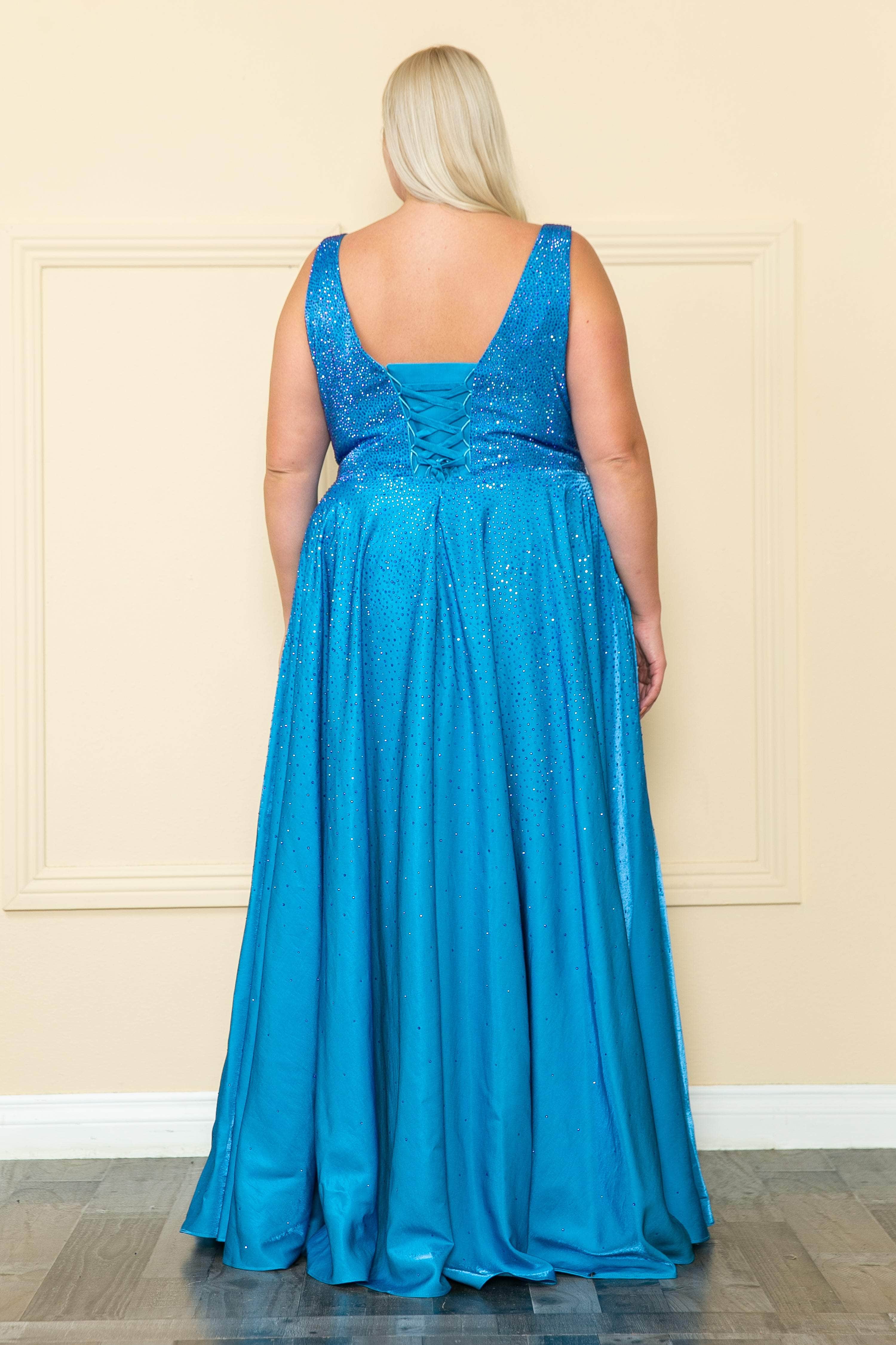 Become a glorified beauty at your sumptuous event in this lavishly ornate Poly USA W1110 plus size creation. Sprinkled with tantalizing rhinestone details and contoured with tailoring lines, this dress features a contoured v-neckline and a sleeveless bodice. Graced with a corset design and an optional cover at the back, the embellished skirt sparkles as it crafts an A-line design with a floor length denouement. Shine with the iridescence of the star while looking so beautiful in this stylish Poly USA W1110 masterpiece. Models are wearing the Magenta, Red and Ocean Blue colors.