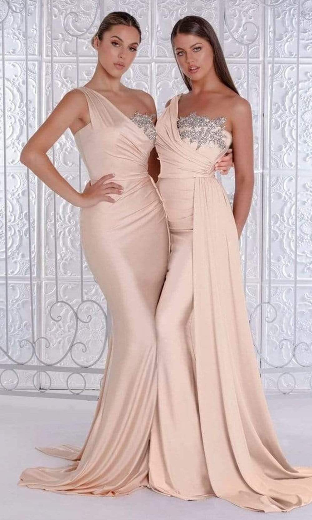 | Details: | Sleeveless, One shoulder, Embellishments, Ruched bodice, Back zipper, Trumpet skirt, Sweep train |
