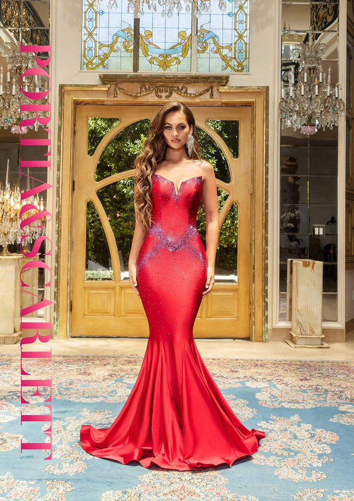 Make yourself a head turner beauty with this shimmering masterpiece by Portia and Scarlett PS22242. This fantastic dress features sparkly beaded silhouette which provide the dazzling effect as the fitted strapless bodice features a modified peaked sweetheart neckline and mid-open zipped up back. A stellar pattern of heat-set stone bead detail highlights the hips and the waist as the skirt parades a fluid mermaid skirt which finishes with a sweep train. Flatter your figure with this Portia and Scarlett dress. The dress is picture in Mauve, Navy and Red colors.