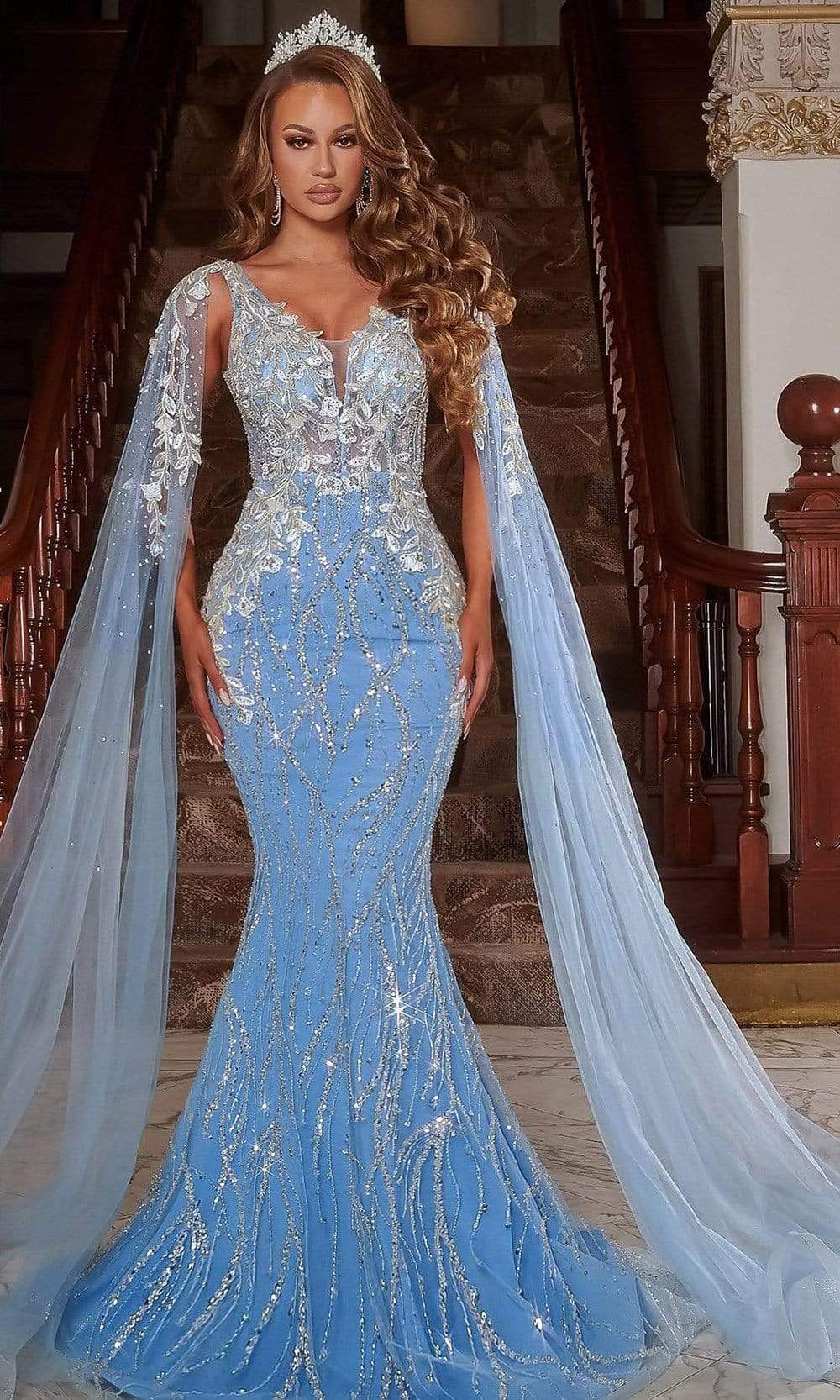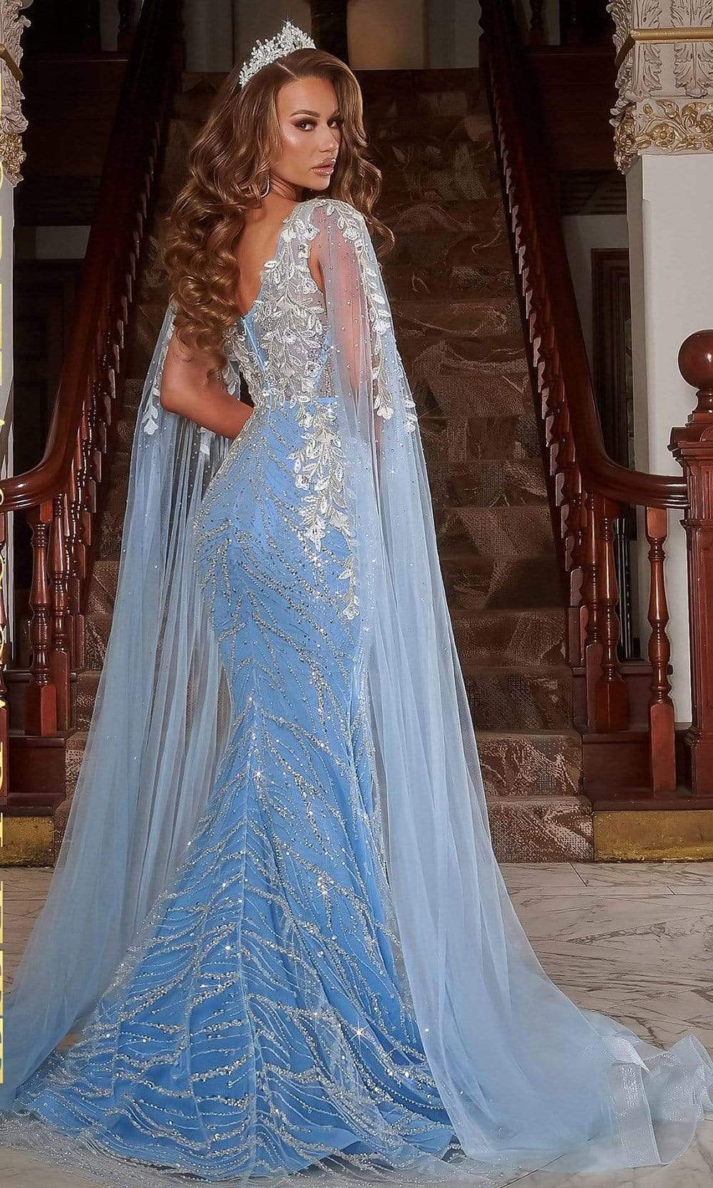 Draw out the princess in you with this Portia and Scarlett PS22257 masterpiece. This dress features a sleeveless and illusion scoop neckline with sweetheart lining and floor length cape sleeves. This fitted dress has a scoop back and back zipper closure. A beaded lace embroidered accents the mermaid silhouette, completed with a sweep train. Experience the outstanding effect in this evening gown by Portia and Scarlett.