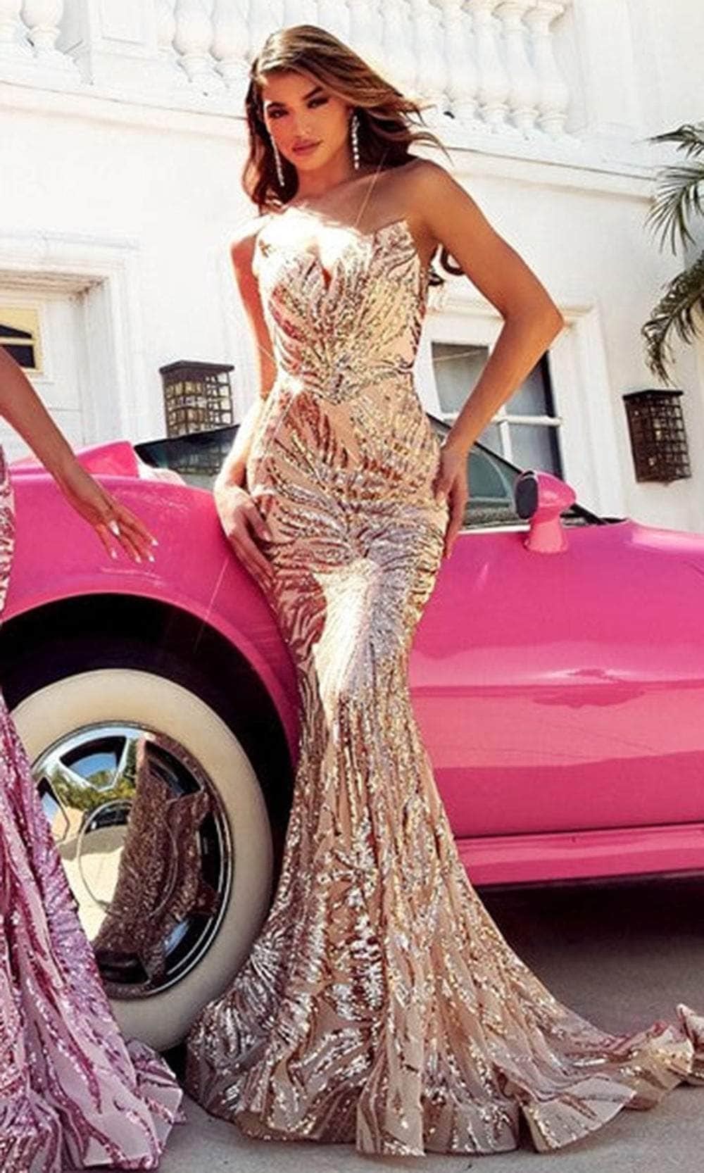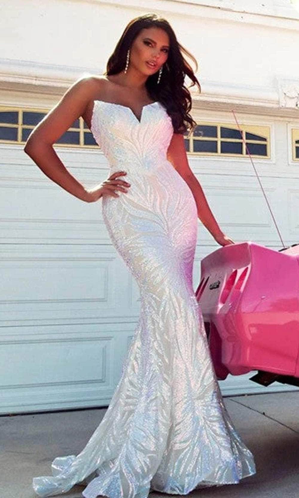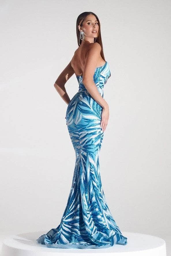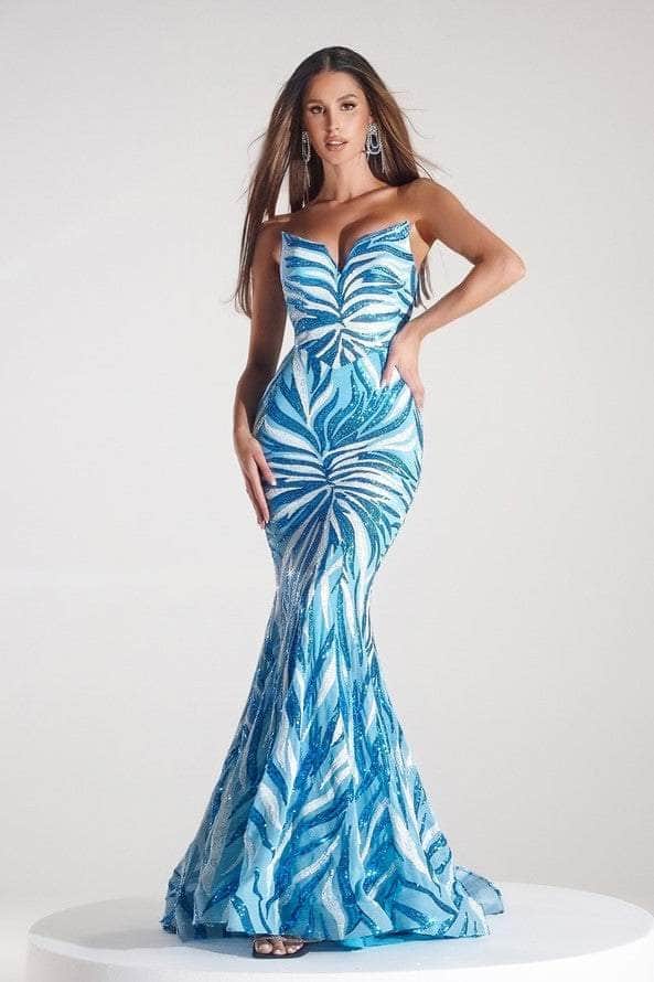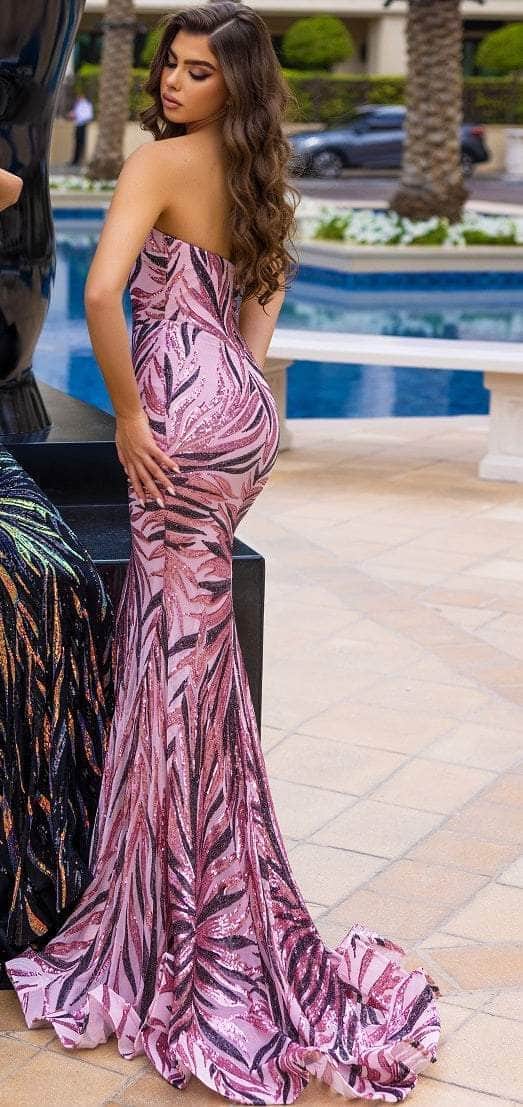 Awe the audience with the radiant class of the stunning Portia and Scarlett PS22538 creation, making you a luminous star of the night. Embellished with a series of foliage sequined details embellishing its sleek length, this stunner crafts an angular v-neckline with a plunge detail. Exquisitely embellished while sculpting the feminine form, the mermaid skirt skims the hips and flares into a sweeping denouement. Allow your sartorial decisions to embody your tasteful flair as you don this Portia and Scarlett PS22538 masterpiece. Models are wearing the Black AB, Black Mint, Ivory Multi, Blush, Champagne, Red, and Emerald colors.
