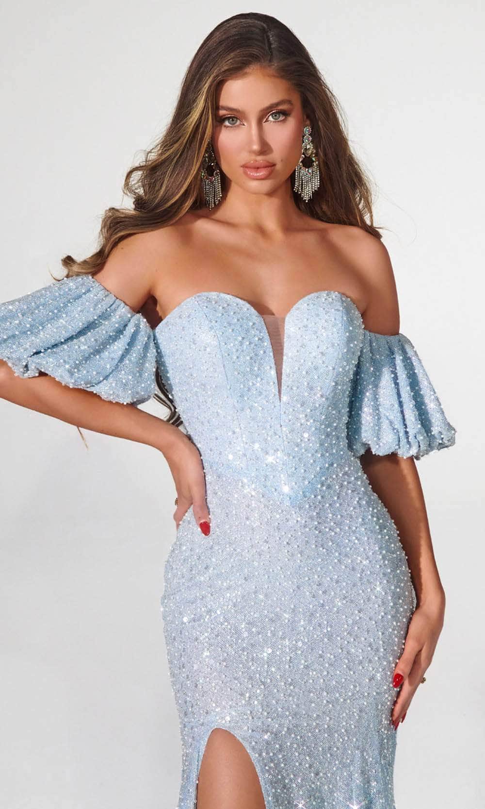 Be a queen of your own right in this stunning evening gown by Portia and Scarlett PS23080. Offering an unforgettable hourglass body, this ensemble is strapless and completely decorated with shining beadwork. The plunging sweetheart neckline includes sheer inset detailing at the bust, and the low-cut back shows some skin. The detachable short puff sleeve gives a two in one look and glamorous touch. Breaking with a thigh-high leg slit, the skirt beautifully forms a mermaid silhouette that pools into a sweeping train. Make a lasting impression in this luxurious Portia and Scarlett PS23080 creation.