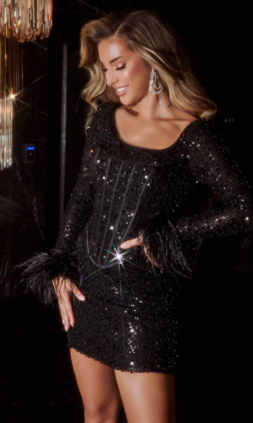 Get ready to party in style and claim the spotlight wearing this stunning cocktail dress by Portia and Scarlett PS23101. Amazingly crafted with a fully embellished bodice with shattered beadings while showcasing a square neckline and feathered cuffs long sleeves. This fitted party ensemble finishes off with a skirt that runs at a mid thigh, while the bodice shows a stunning boning structure and basque waistline. Claim your spot as the darling of the party in this gracefully rendered Portia and Scarlett creation. Model is wearing Black, and White colors.