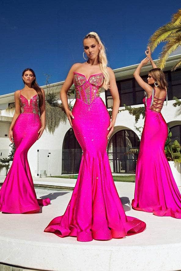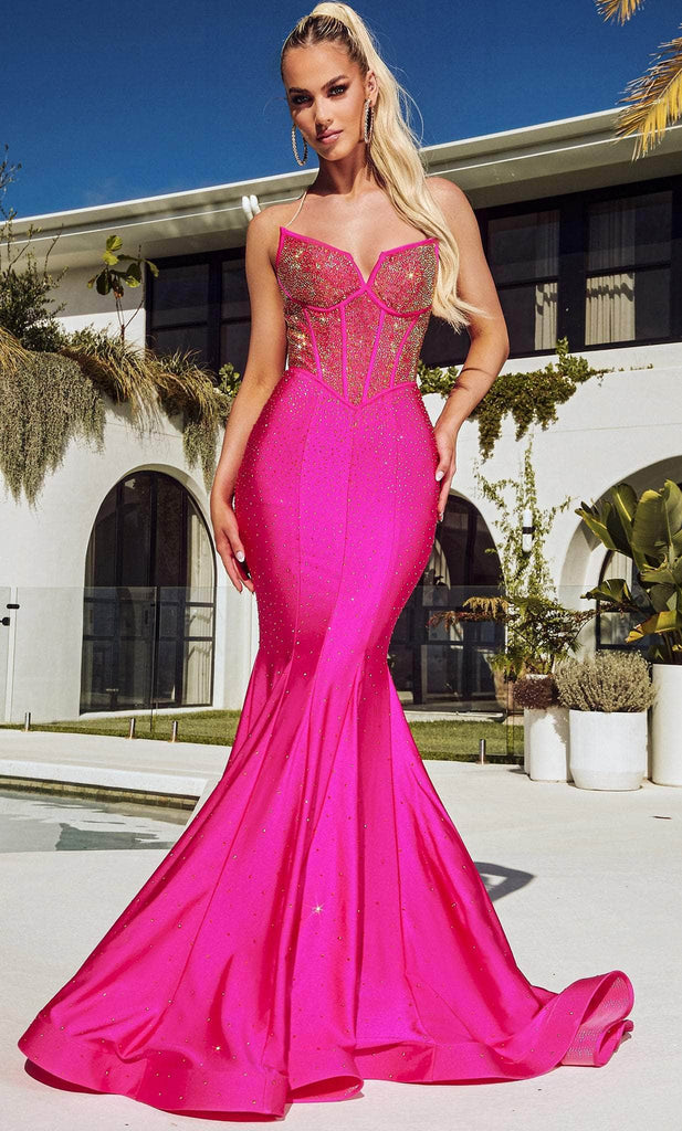 Be bound to steal the spotlight in this Portia and Scarlett PS23360 masterpiece. The statuesque gown highlights the beaded rhinestones embellishment and princess seams detailing on the fitted bodice. It features an exposed boning on the corset bodice with a modified sweetheart neckline, basque waist and spaghetti straps for support. This style is completed in a magnificent mermaid skirt that glides in a dramatic sweep train and has a horsehair hem. Take your seat on the throne in a queenly gown from Portia and Scarlett PS23360. Model is wearing the Hot Pink color.