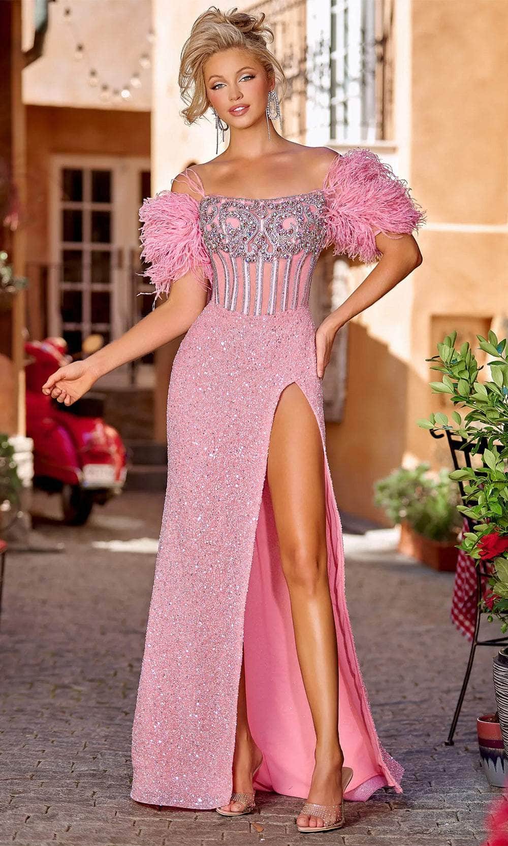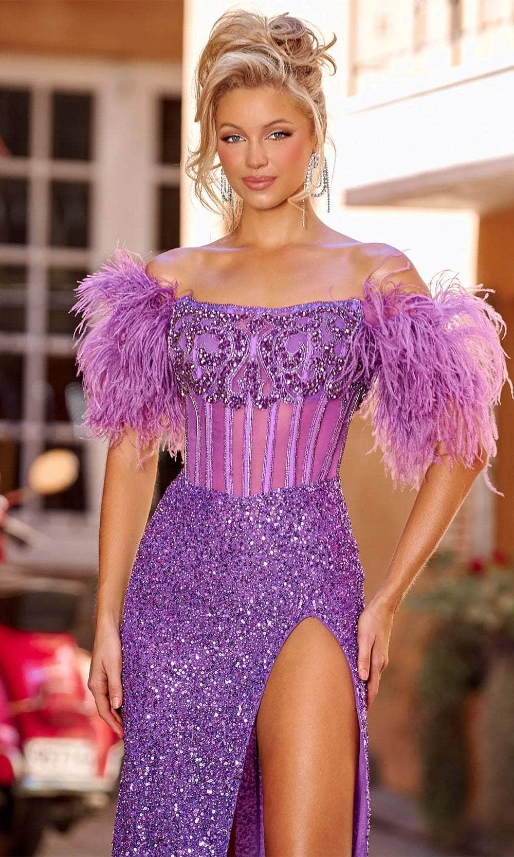Get ready to turn heads in this mesmerizing Portia and Scarlett PS23741 creation that exudes elegance and allure. Exquisitely styled with scintillating details, this stunning gown has an off-shoulder neckline beautifully accentuates the d̩colletage. Graced with an intricately embellished bust adds a touch of opulence and glamour, this beauty also flatters its silhouette with feather fringes delicately adorning the sleeves. Adding a sense of whimsy and movement, the sheer midriff parades exposed corset boning details that offers a tantalizing glimpse of skin. Accentuated with a sheer midrise back adds an element of intrigue and sophistication, the sequined sheath silhouette features soft draping while showcasing a high slit while the sweep of the train creates a graceful and captivating presence. Embrace your inner goddess and make a lasting impression in this stunning Portia and Scarlett PS23741C masterpiece. Models are Blue, Ivory, Pink, and Purple colors.