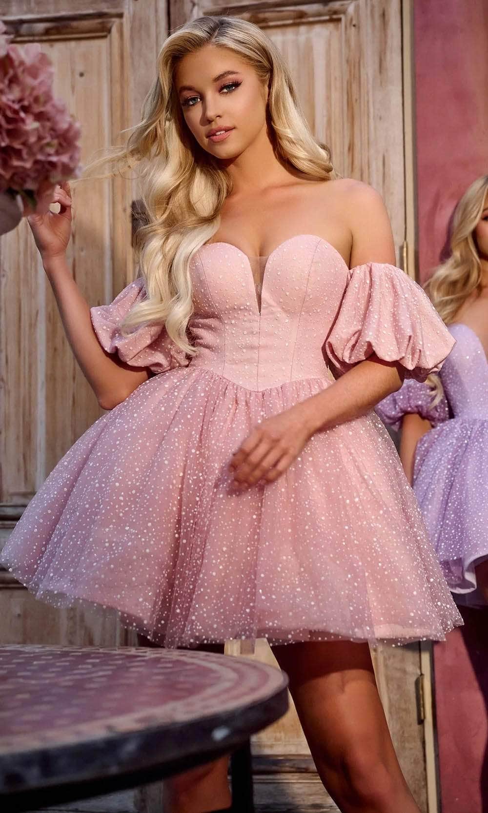 Get primed to climb that social ladder as you captivate the crowd in this chic Portia and Scarlett PS24006 creation. Showcasing a textured snow like detail embellishing its length, this breathtaking dress featuring a sweetheart neckline and a plunging illusion overlaid bodice. The strapless design highlights your shoulders and collarbone with grace and elegance. Puff sleeves add a touch of romantic charm, while the corset back ensures a perfect fit. The layered voluminous skirt creates a sense of drama and movement with its short hemline. Exude a youthful charm and playfulness in this enchanting Portia and Scarlett PS24006 masterpiece. Models are wearing the Black, Blue, Lilac, and Pink colors.