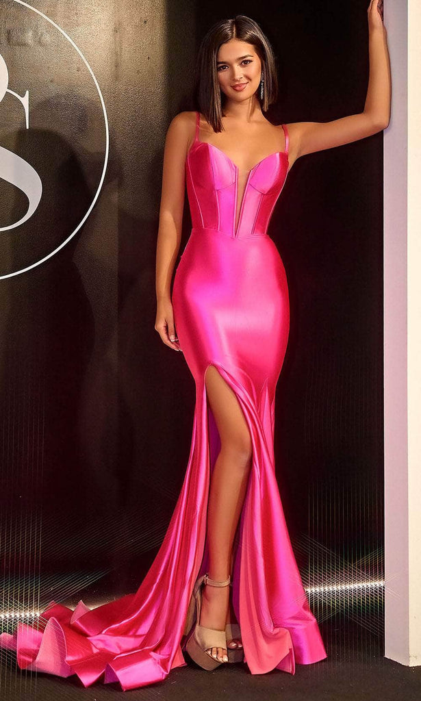 Experience elegance at its finest with the Portia and Scarlett PS24403 masterpiece. The sleeveless gown displays a spaghetti strap that beautifully complements the plunging v-neckline. In addition, the lace-up back guarantees a personalized fit that is both cozy and attractive. The corset bodice with visible boning and ruching at the low back effortlessly sculpts your figure. The skirt reveals a godets accent to create a magnificent mermaid silhouette. Completed by thigh-high leg slit and sweeping train for a dramatic effect. This Portia and Scarlett PS24403 gown is specially designed to make that special occasion worth reminiscing. Models are wearing Cobalt, Hot-Pink, and Plum colors.