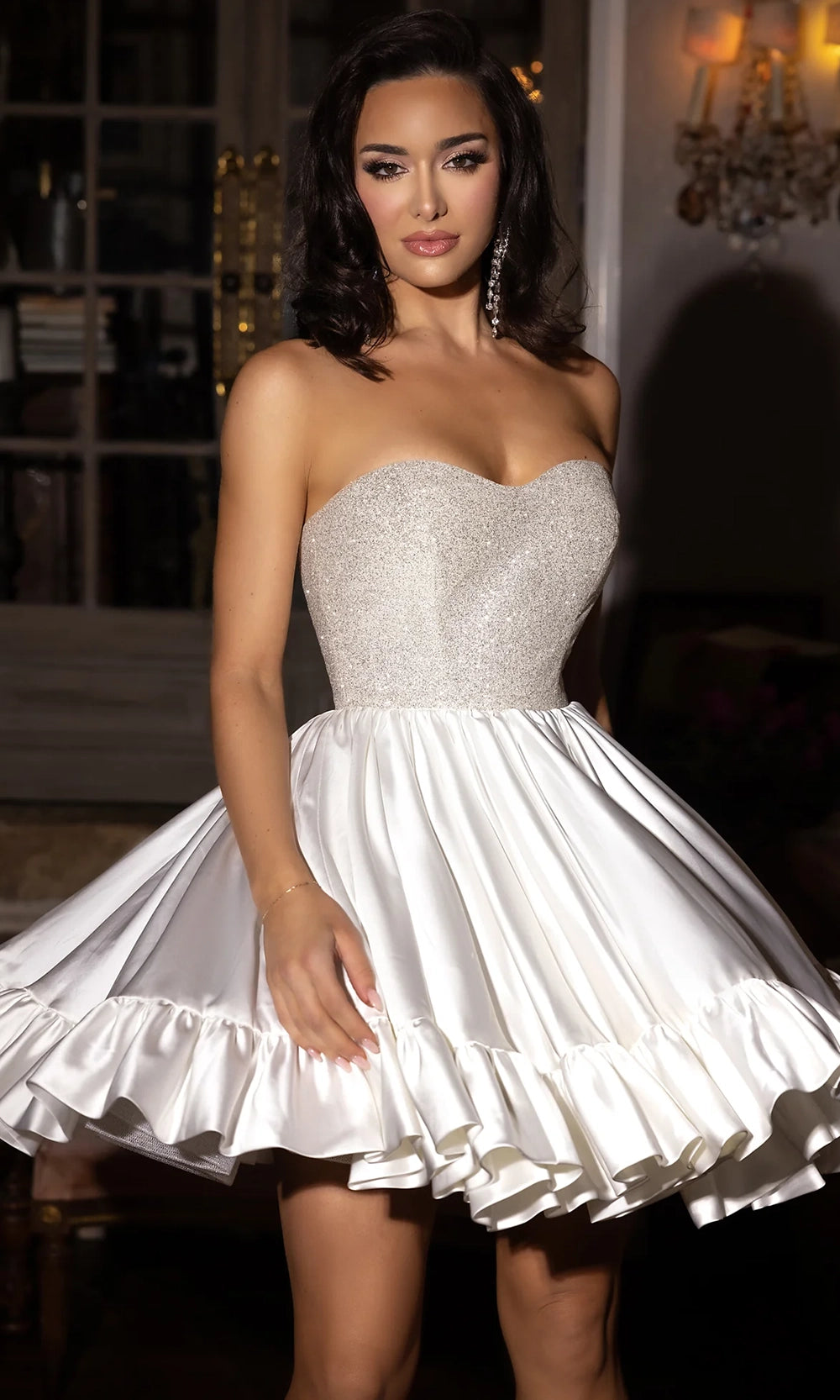 There is instant radiance in the charming silhouette of Portia and Scarlett PS24418. A glitter coated bodice captures light and detail, framed by a soft sweetheart neckline that gently defines the bust. The A-line skirt flares out with clean movement, finishing in a subtle ruffle that adds a youthful touch to the short hem. A classic shape meets modern sparkle in a look that never fails to leave a mark. Own the room with confidence in Portia and Scarlett PS24418 cocktail dress. Models are wearing Champagne, Pink, and White colors.