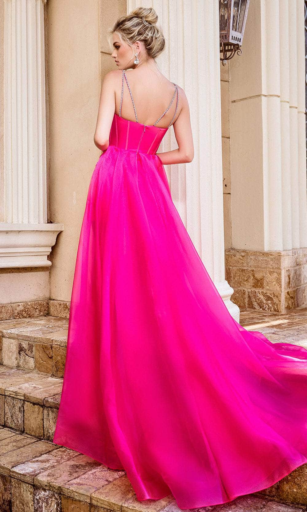 Prepare yourself for an incredible evening in this opulent creation from Portia and Scarlett PS24509X. The sleeveless gown features two beaded spaghetti straps that encircle the shoulders and form an alluring v-neckline. In addition, it has a sweetheart bust that adds a touch of femininity and a visible corset boning bodice. The sheath skirt skim to the short hemline, enhanced by a side slit with beaded bow detailing. For a dramatic effect, the pleated A-line overskirt pools into a sweeping train. You are sure to turn heads in this Portia and Scarlett PS24509X masterpiece. Models are wearing Black, Hot-Pink, and Light-Pink colors.