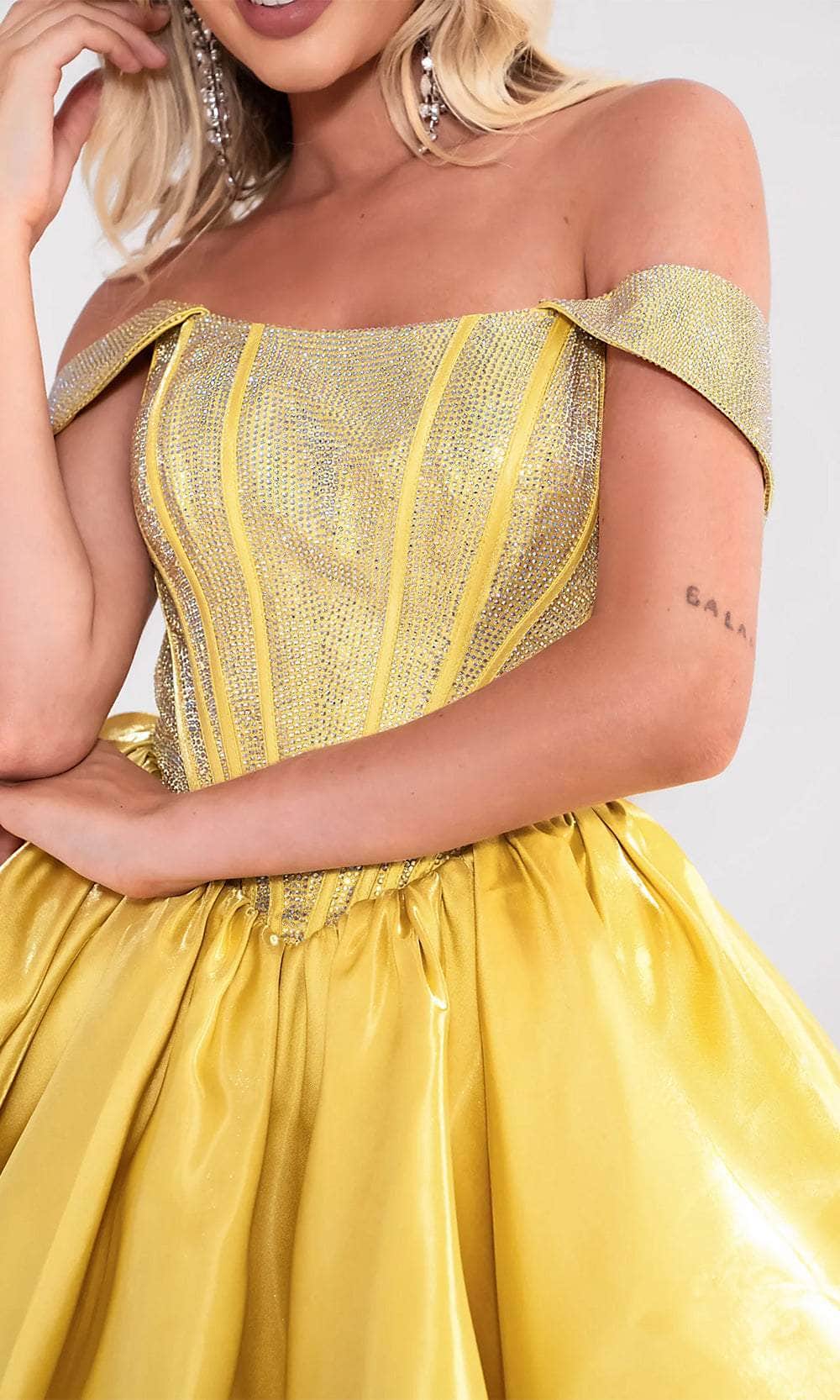 Embrace the spotlight in the captivating Portia and Scarlett PS24762 cocktail dress. This dazzling design shimmers with rhinestones scattered throughout the bodice. The off-the-shoulder neckline offers a touch of allure, while the strategically placed corset boning cinches your waist for a flattering silhouette. The back truly steals the show, featuring a dramatic lace-up closure that accentuates the open back design. The A-line skirt gracefully flows from the fitted bodice, skimming your curves before finishing in a playful short hem. This Portia and Scarlett PS24762 masterpiece is the perfect blend of elegance and boldness. Models are wearing the Yellow, Cobalt, Emerald, and Red colors.