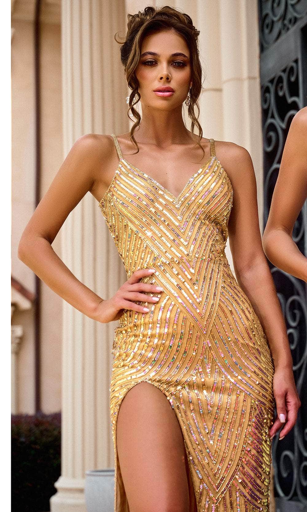 Showcase a fashion sense that flourishes allure in this Portia and Scarlett PS24816X creation. Step into elegance with this mesmerizing gown adorned with delicate spaghetti straps and a V-neckline that exudes timeless sophistication. The gown is embellished with a captivating geometric chevron sequin motif, adding a touch of glamour with every movement. The V-open back adds an alluring element, and the concealed zipper closure ensures a seamless fit. The sheath skirt gracefully drapes, featuring a high slit that adds a hint of allure. Completing the ensemble, a sweeping train adds a touch of drama, making this Portia and Scarlett PS24816X masterpiece is a perfect choice for a chic and memorable occasion. Models are wearing the Black Gold, Ivory Gold, Gold, Pink, Purple, Silver, and Ivory AB colors.