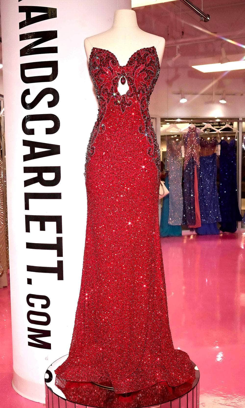 Command attention in the Portia and Scarlett PS24878C dress. This ensemble is a dazzling creation adorned with sparkling sequins and rhinestones in an intricate pattern. The strapless fitted bodice, boasting a sweetheart neckline and a chic cut-out, radiates glamour. The back zipper closure ensures a seamless fit, while the floor-length sheath silhouette of the skirt is elevated with a sweeping train for added drama. This Portia and Scarlett PS24878C is an exquisite choice for any special occasion. Model is wearing Red color.