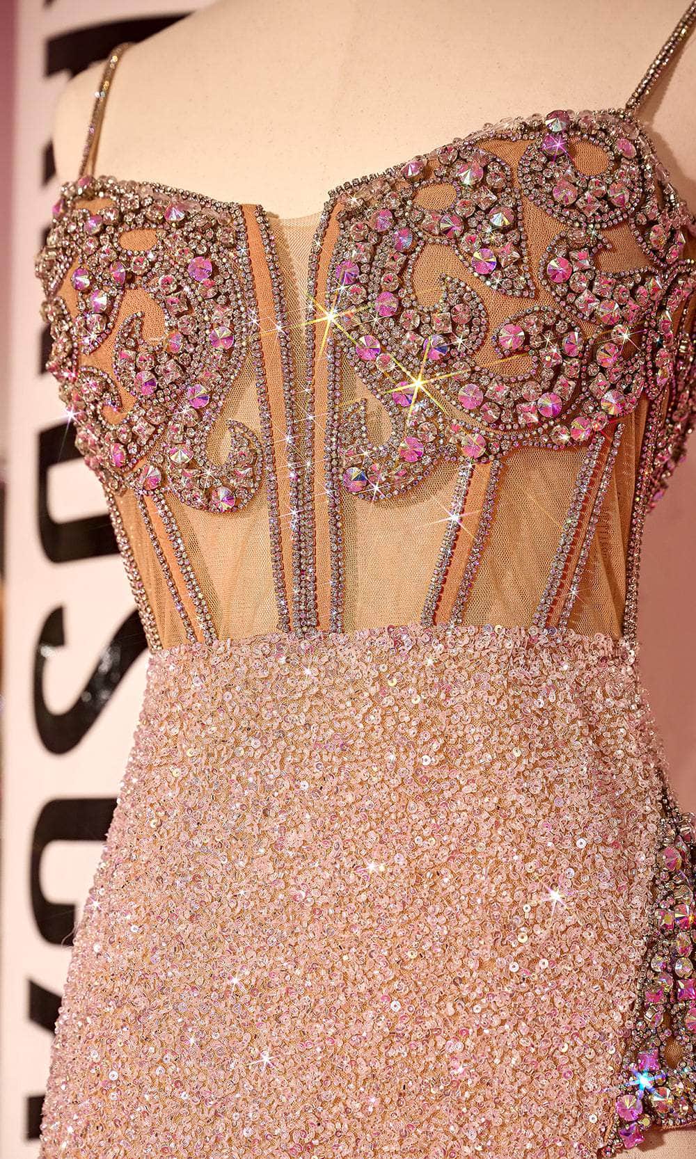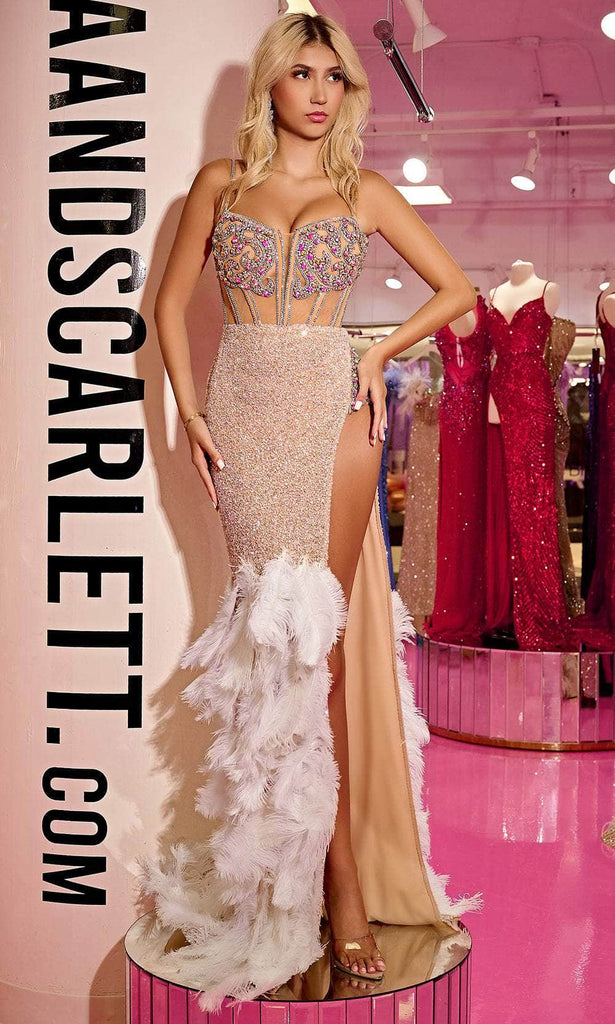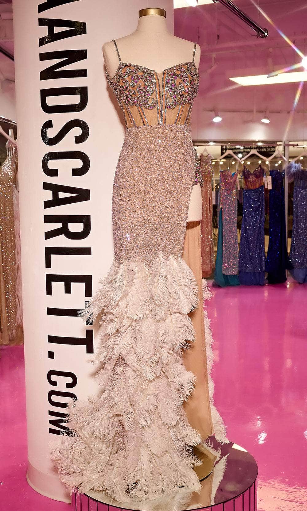 Sparkle in the Portia and Scarlett PS24881C dress—a vision of opulence adorned with sparkling rhinestones. The sleeveless corset bodice, boasting a scoop neckline and beaded straps, emanates glamour. A back zipper closure ensures a seamless fit, while the floor-length sheath silhouette of the skirt is adorned with sequins and feathers for added allure. Accentuated with a slit and a trailing train, this Portia and Scarlett PS24881C promises a captivating ensemble that seamlessly blends sophistication and glamour for any special occasion. Model is wearing Silver-Nude color.