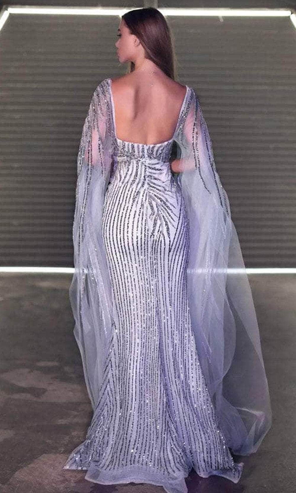 | Details: | Cascading Long Sleeves, Sequin Embellished, Sheer Insert, Mid-Open Back, Back Zipper Closure, Slit, Train |