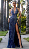 Enter a realm of elegance and style with the Portia and Scarlett PS25162 prom dress, adorned with carefully arranged stones that create a dazzling look. Featuring a sleeveless bodice and plunging halter neckline, it offers both drama and sophistication. The midrise back, along with the sleek sheath skirt that includes a slit and sweep train, adds refined elegance. This Portia and Scarlett PS25162 gown is a flawless choice for prom, embodying both glamour and grace. Models are wearing the Fuchsia, Blue, Emerald, Lilac, Black, Cobalt, Red, and Navy colors.