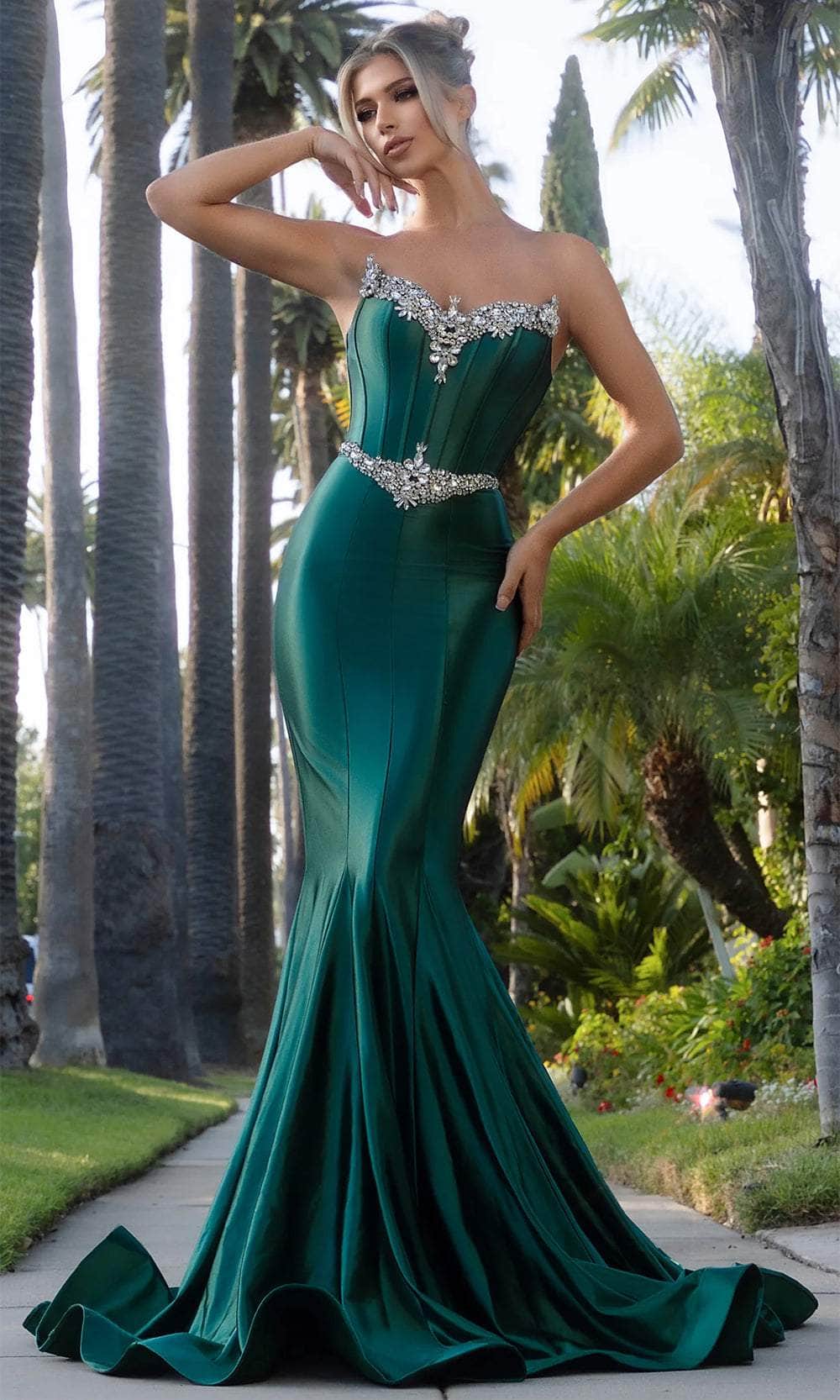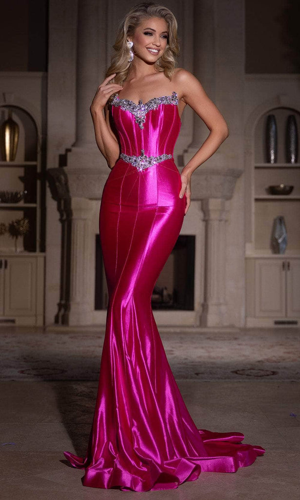 Turn heads in the Portia and Scarlett PS25261 prom dress, a stunning design with a sleek, tailored silhouette that beautifully highlights your shape. The strapless bodice, adorned with a crystal-embellished neckline, brings a glamorous and refined touch. With corset boning for a flawless fit and an elegant midrise back, the gown flows into a mermaid skirt that ends in a graceful sweep train. Make an unforgettable entrance in this Portia and Scarlett PS25261 masterpiece, perfectly crafted to enhance your figure with style. Models are wearing the Hot Pink and Emerald colors.