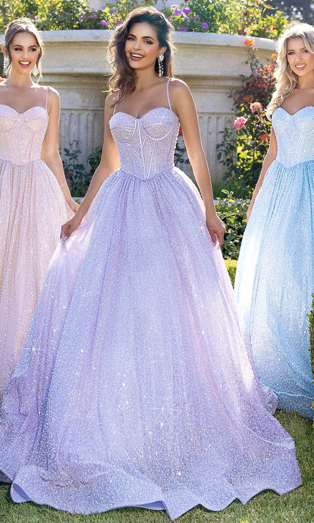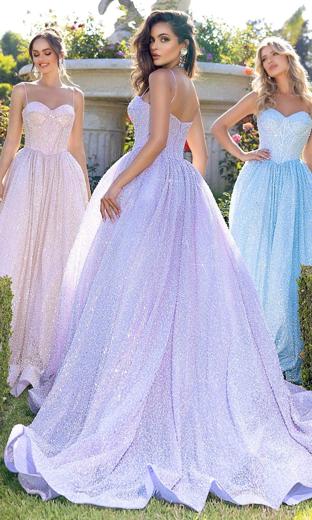 Step into a world of fairytale elegance with this Portia and Scarlett PS25308 masterpiece. This gown creates a show-stopping and shiny look thanks to its lavish beadings from top to hem. Spaghetti straps lead to a beautifully structured corset bodice, complemented by the sweetheart neckline and straight midrise back. The layered skirt makes a ballgown silhouette that cascade with ethereal volume, complete with sweeping train that glides charmingly behind. Feel like a true princess by wearing the Portia and Scarlett PS25308 long gown. Models are wearing Blue, Lilac, and Pink colors.