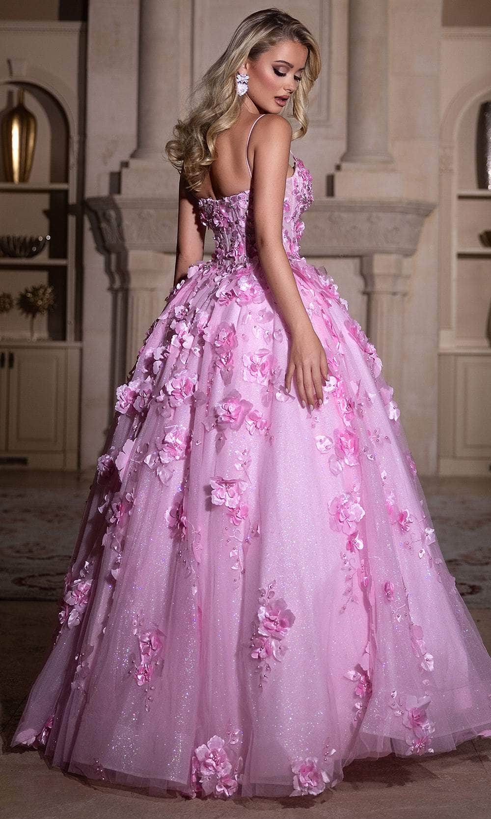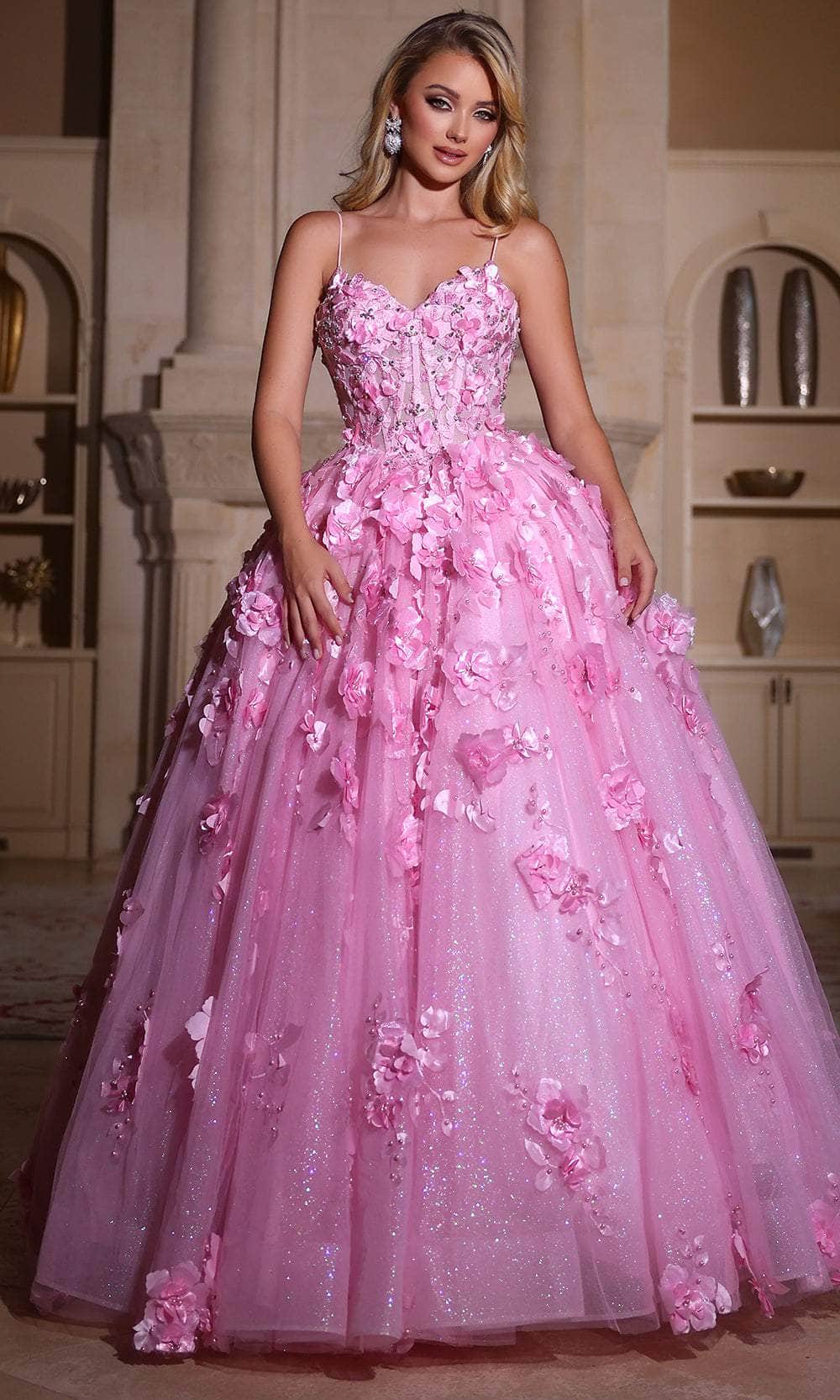 Look stunning in photos wearing this Portia and Scarlett PS25360P ballgown, that is the epitome of romantic elegance. This stunning gown features a sweetheart neckline and a corset bodice that accentuates the waist, creating a timeless and feminine silhouette. Thin straps add a delicate touch, while the mid-open back with a concealed zipper ensures a perfect fit. The dress is adorned with intricate 3D flowers and lace, adding depth and texture to the design. With no stretch, this gown maintains a structured and regal appearance, making Portia and Scarlett PS25360P ideal for grand occasions and ensuring you make a lasting impression. Model is wearing Pink color.