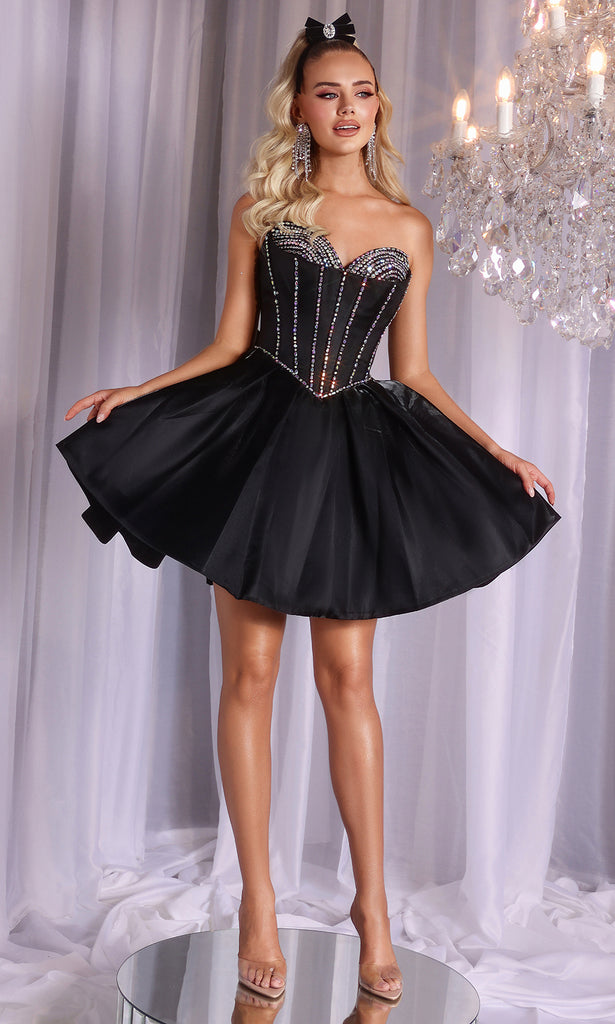 | Details: | Beaded Bust, Corset Boning Bodice, Strapless, Flared Pleated Skirt, Bow Accent |